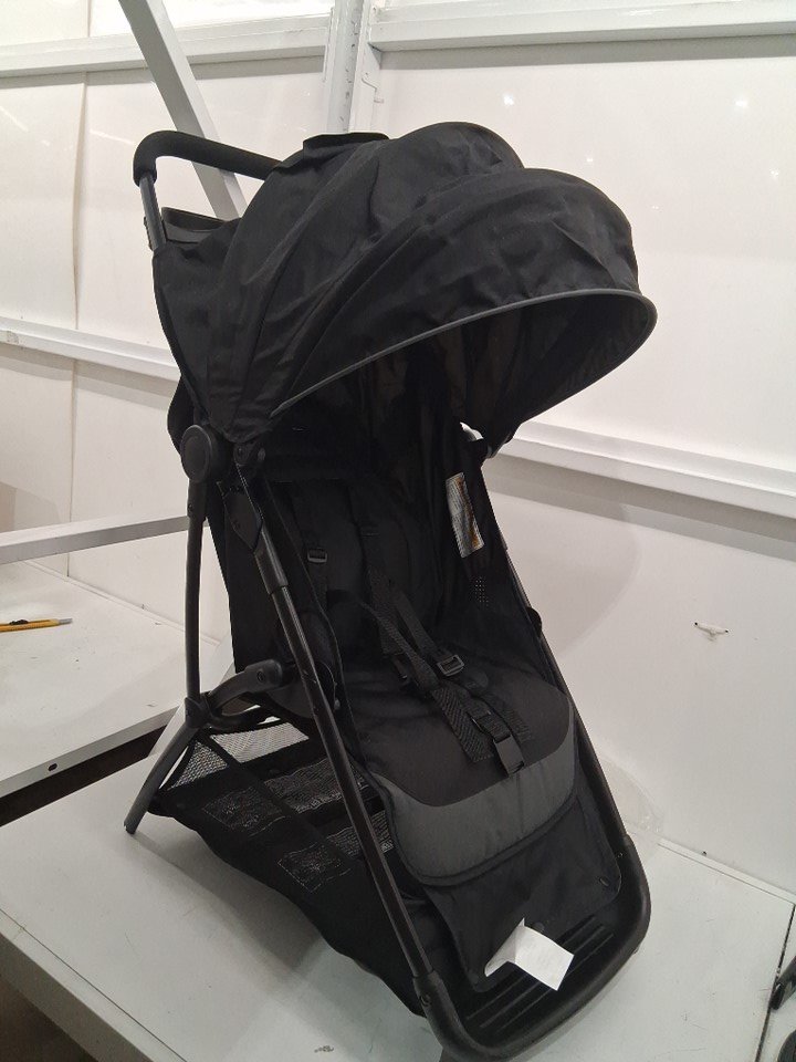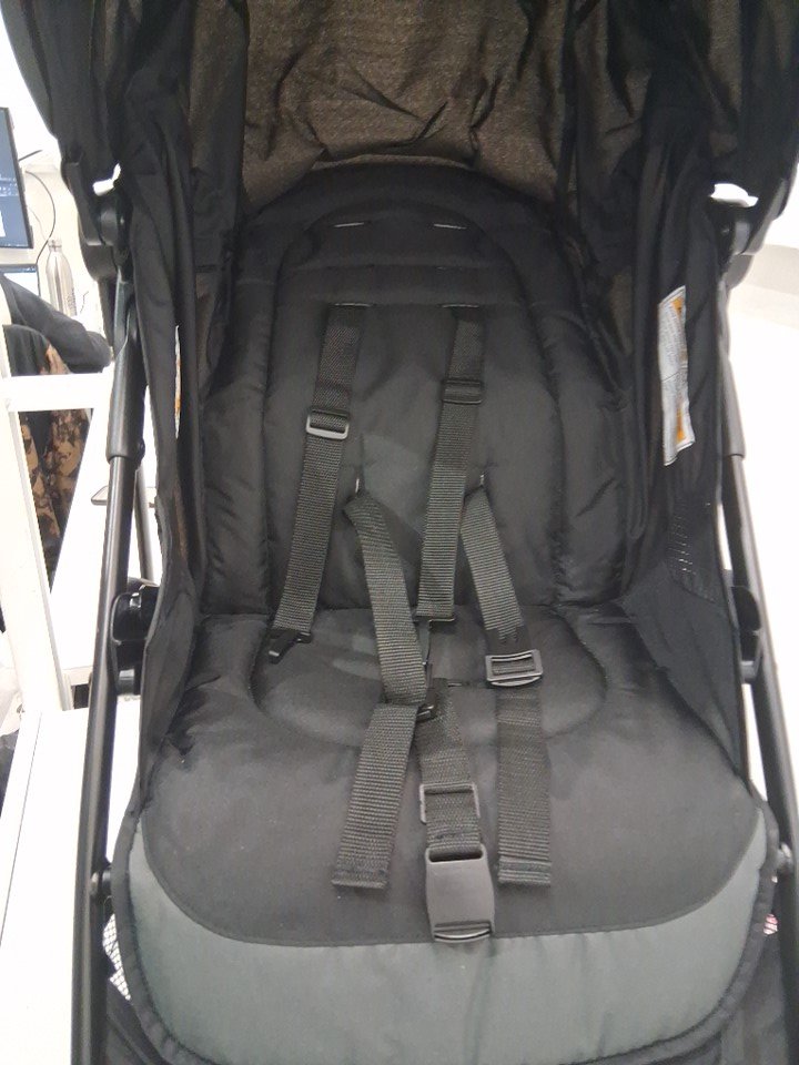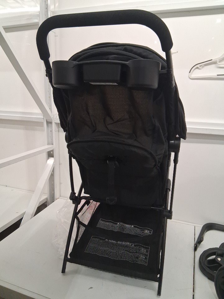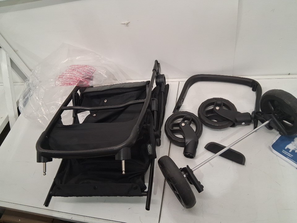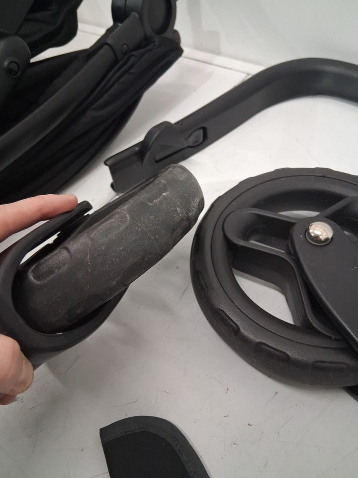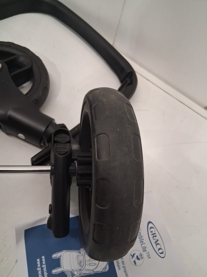 Wheels have visible dirt discoloration and back wheels are assembled to rod