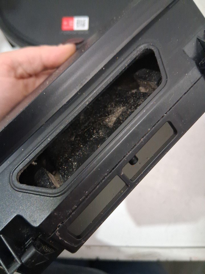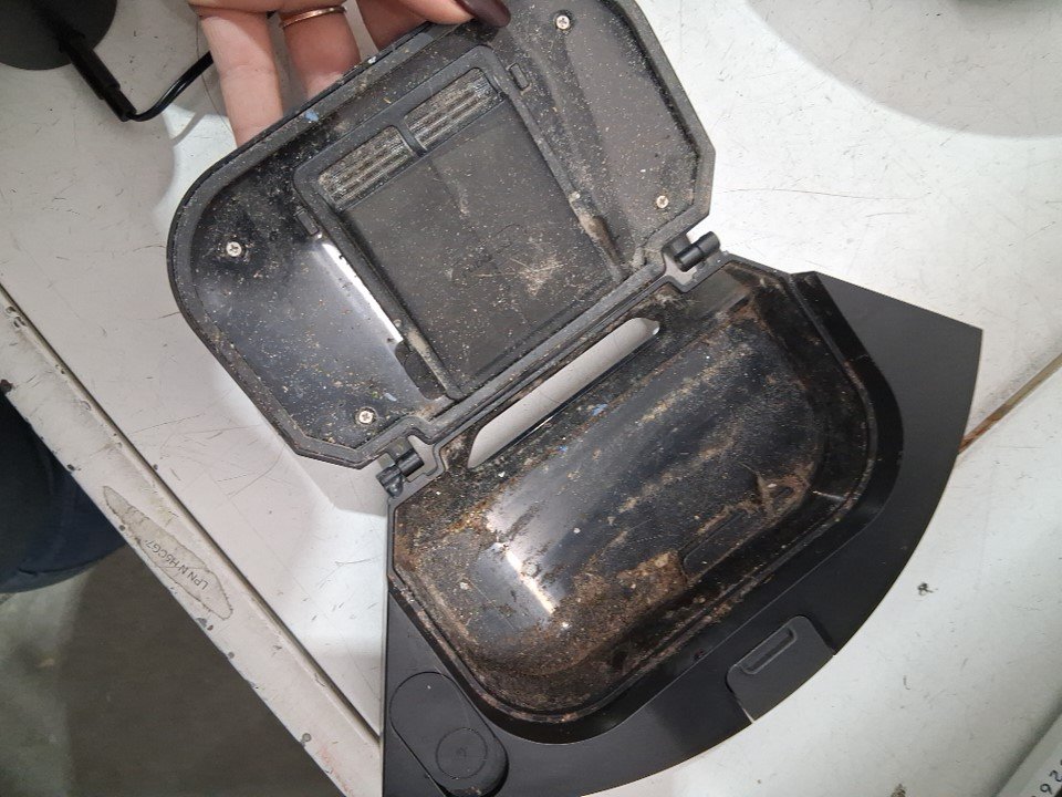 item has some dirt in pickup as well as on mop pad and wheels. there are also some small scuff marks on the bumper plate from previous light use
