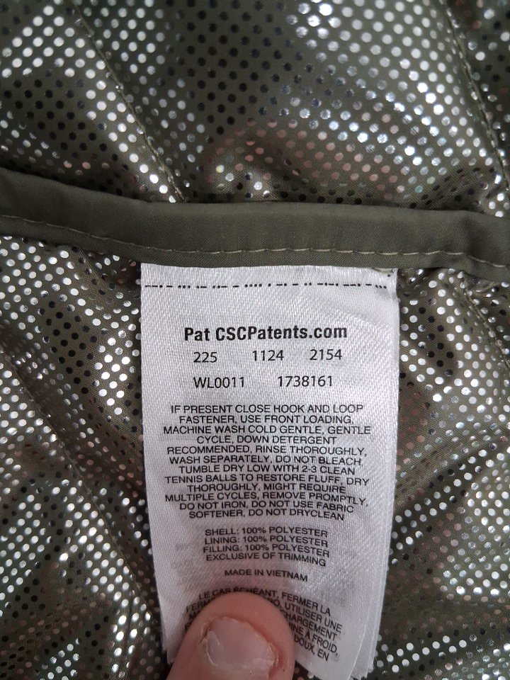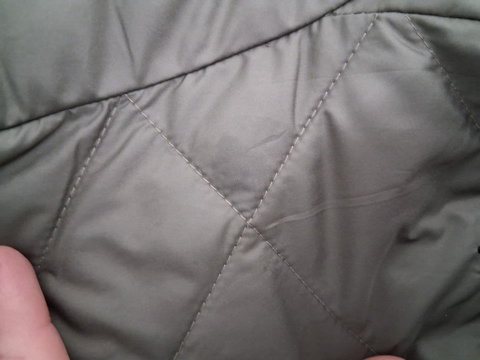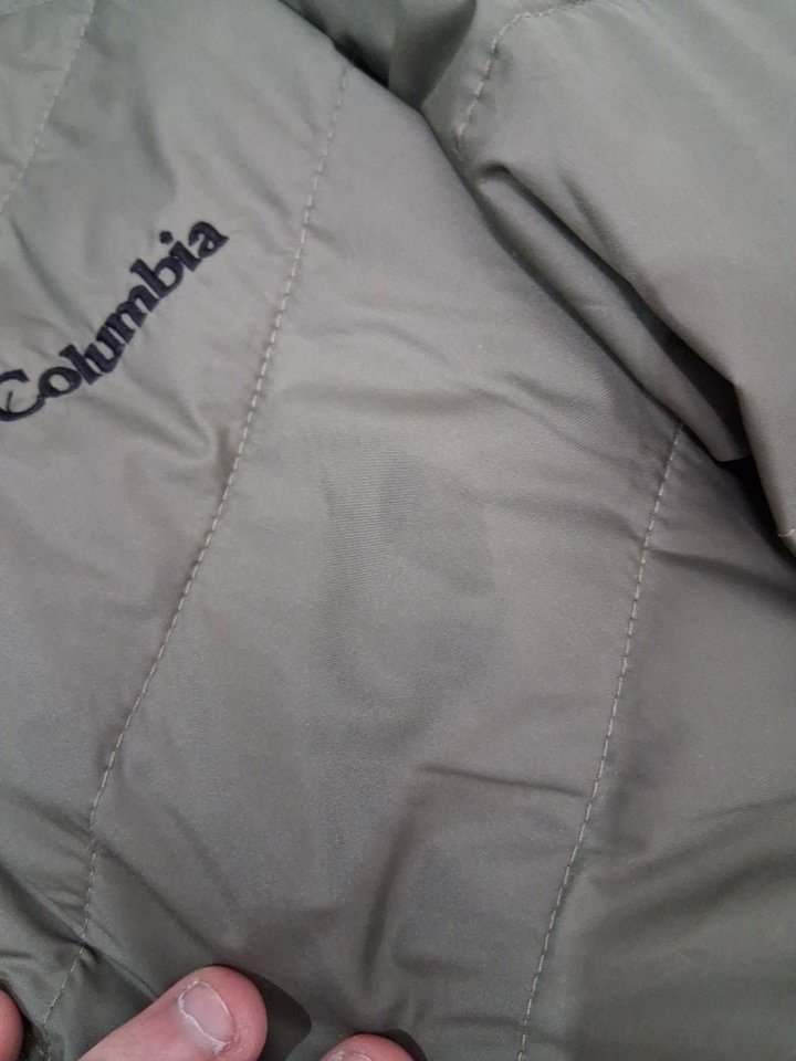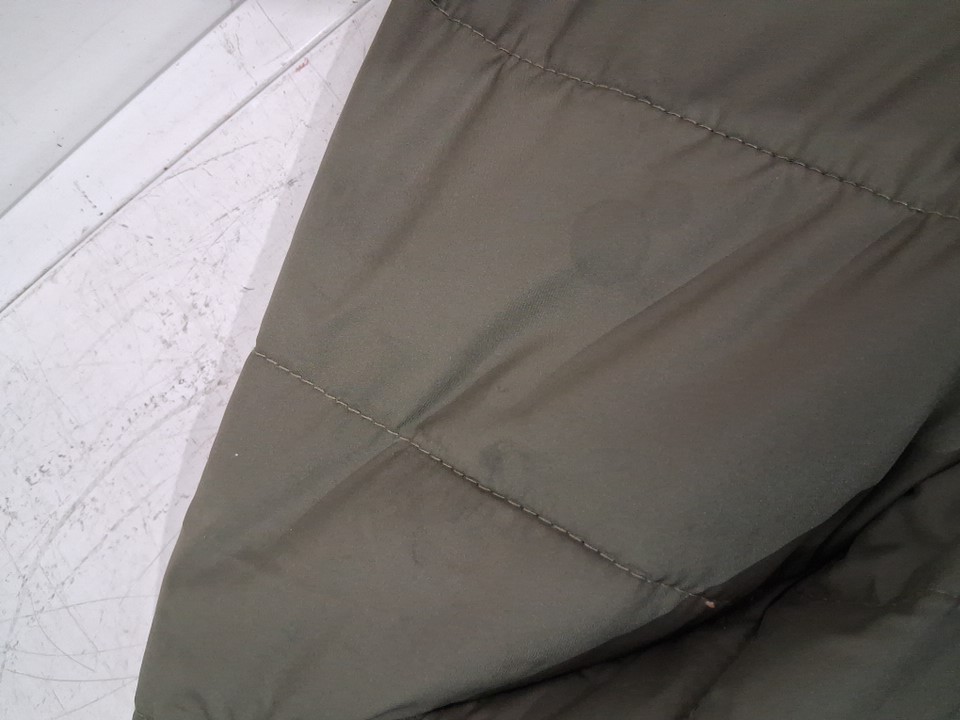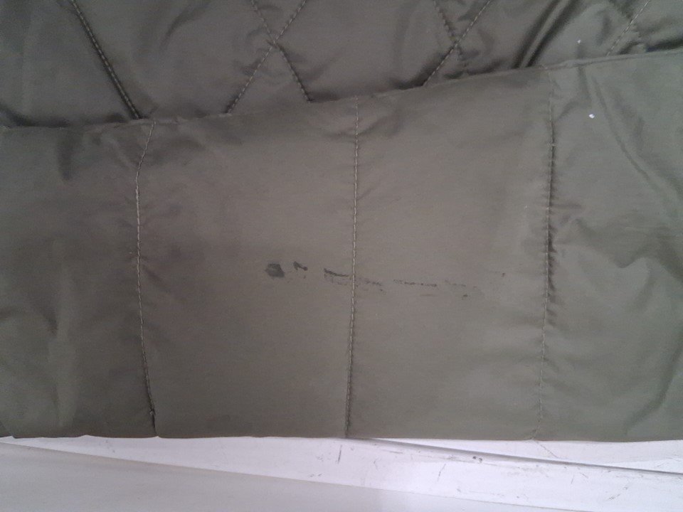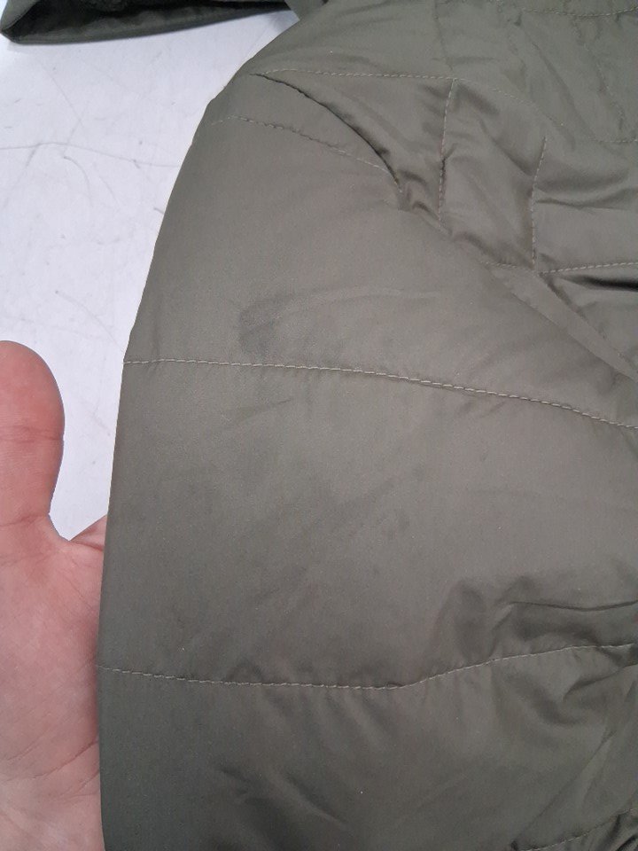 There are small stains on the jacket from previous use, most of the stains are on the left arm/left side but there are a couple on the right side as well. Please see photos.
