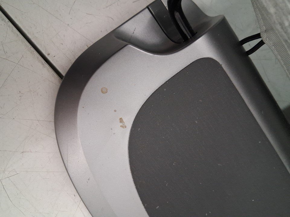 There are liquid droplet stains on the edge of the base and at the front part of the base. The headrest looks like it is also browning a bit from previous use, but it should go away with a wash.