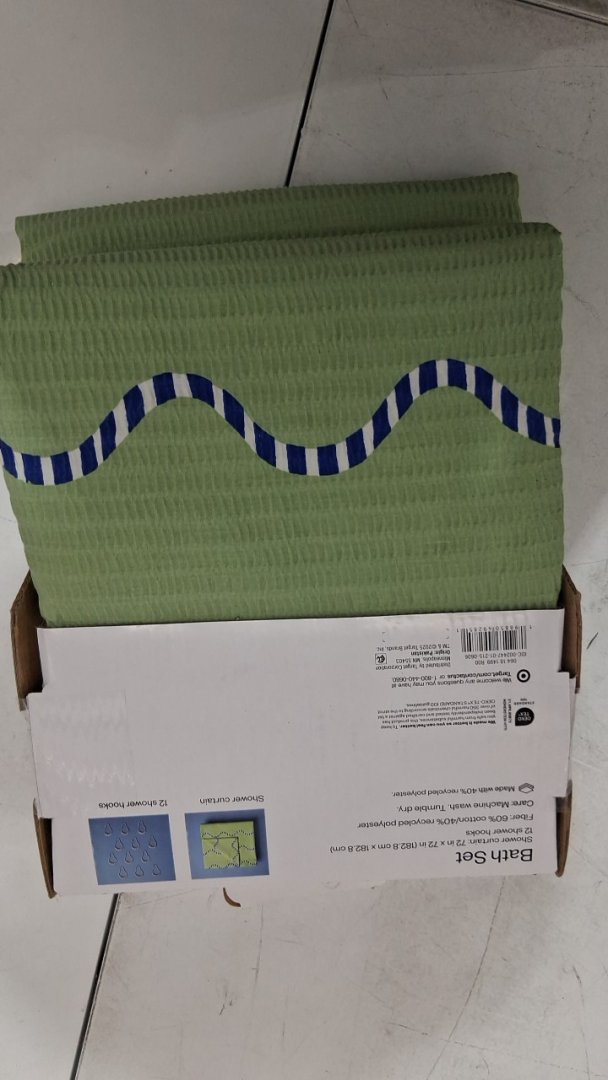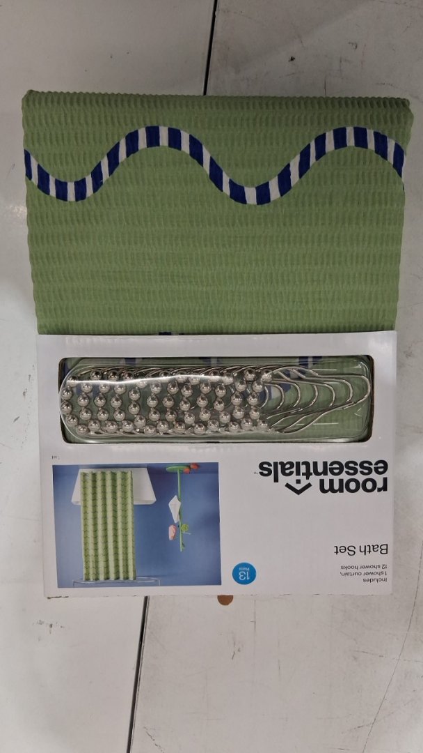 13PC room essentials FABRIC SHOWER CURTAIN bath SET WITH SHOWER HOOKS - 72" x 72" - Green/Blue
