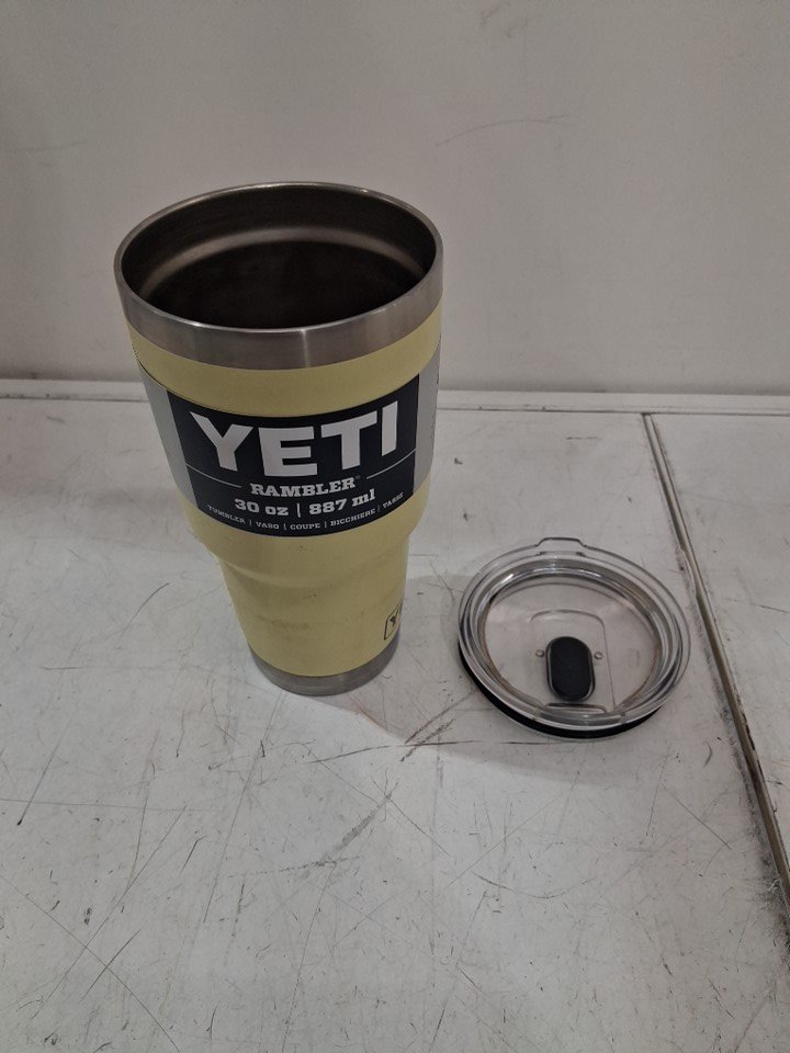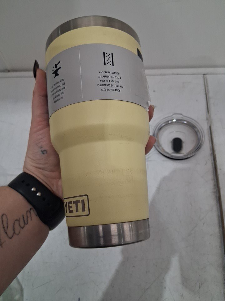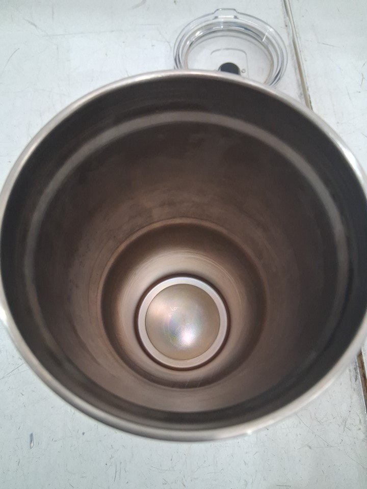 item has some marks around the outside and coffee stains on the inside from previous use as well the slider tab lid is missing