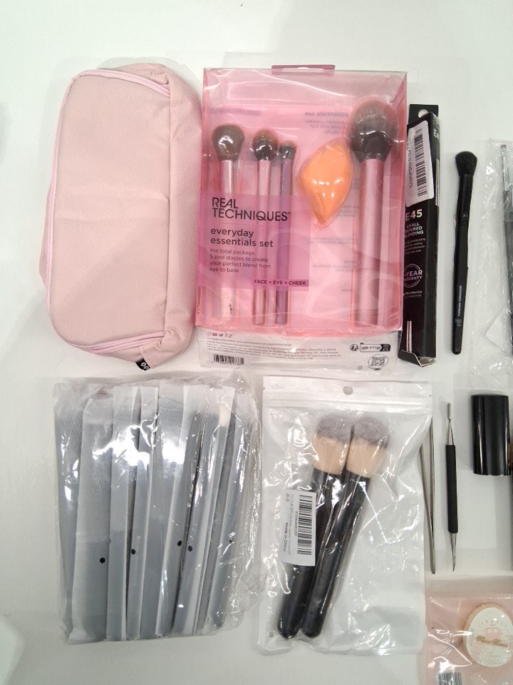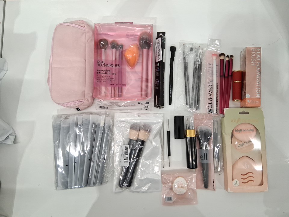 50+ assorted makeup brushes face tools and nail tools - assorted brands and types - face brushes / face sponges / eyeshadow brushes / tweezers / makeup bag