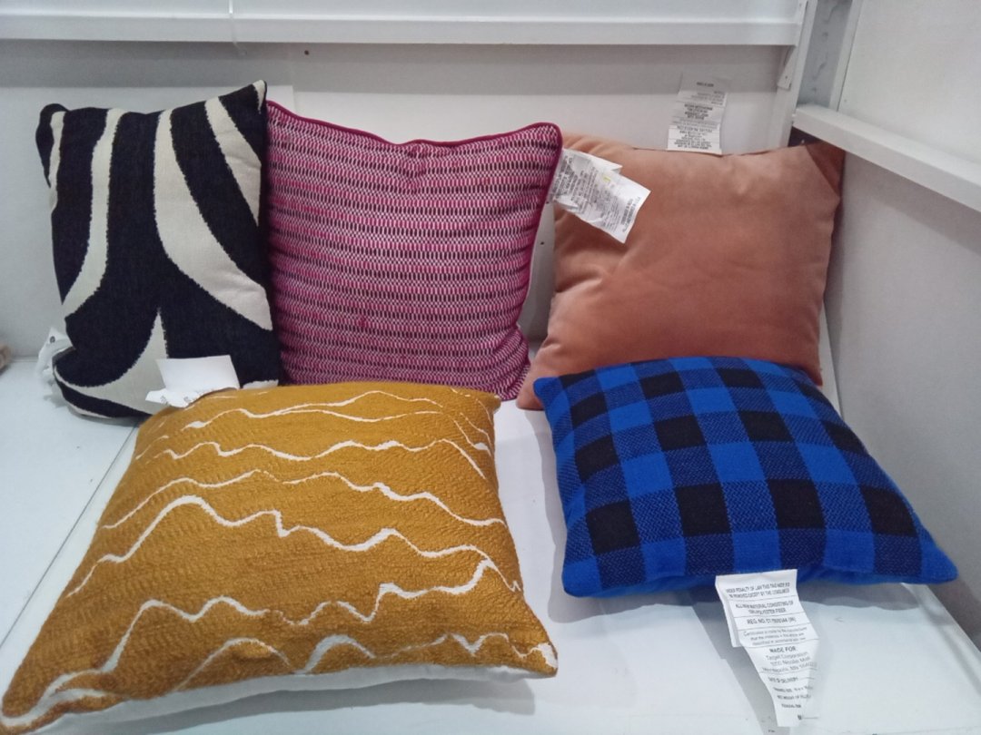 Some pillows have light dirt stains from transport without proper packaging. There are some pulled threads on the pink/red pillow. Please see photos.