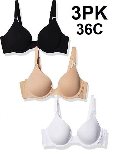 3pk women's fruit of the loom underwire light lined t-shirt bras - 36C - black/white/beige (style: ft797pka)