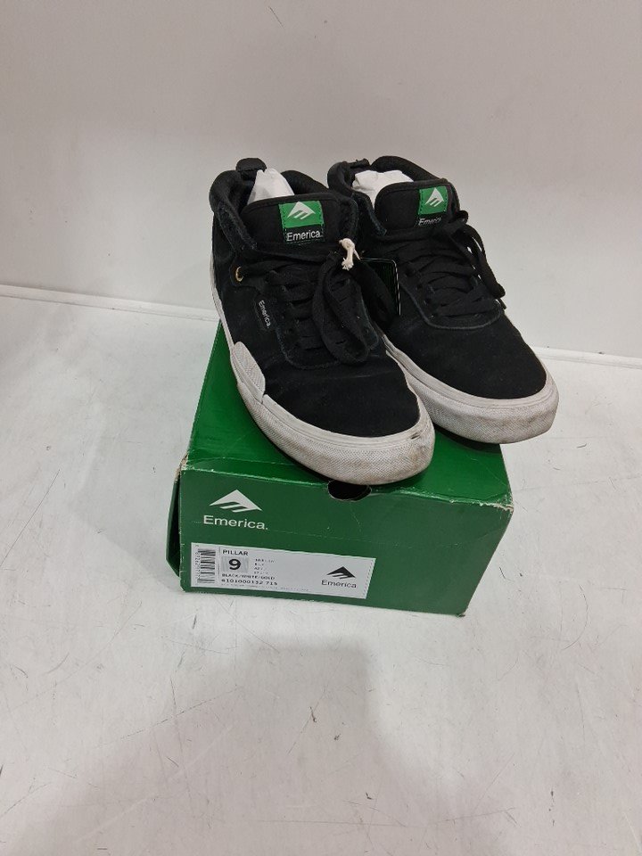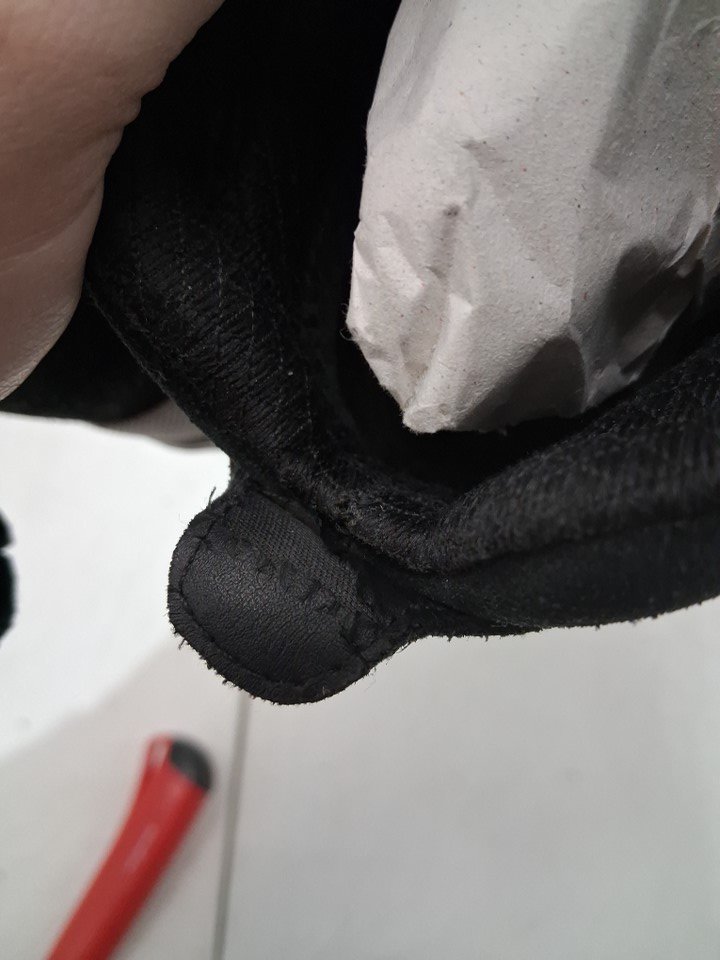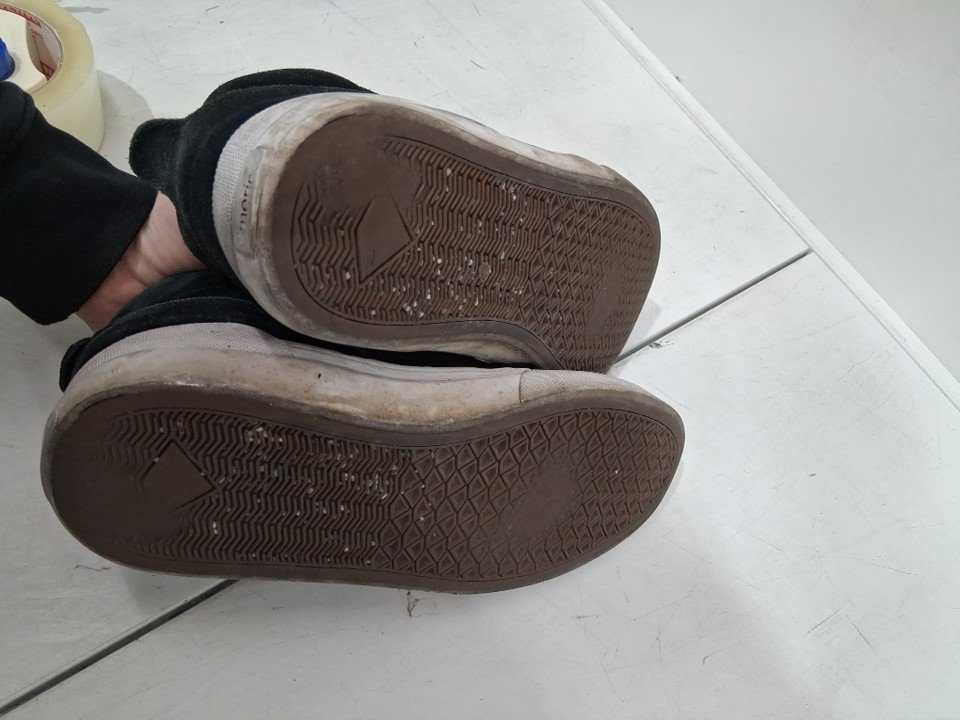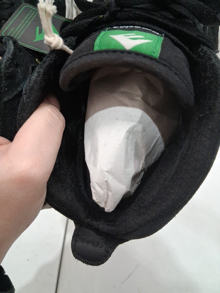 there is wear of the material on the back of the heel. dirt and debris on the entirety of the shoes. tags are starting to come off.