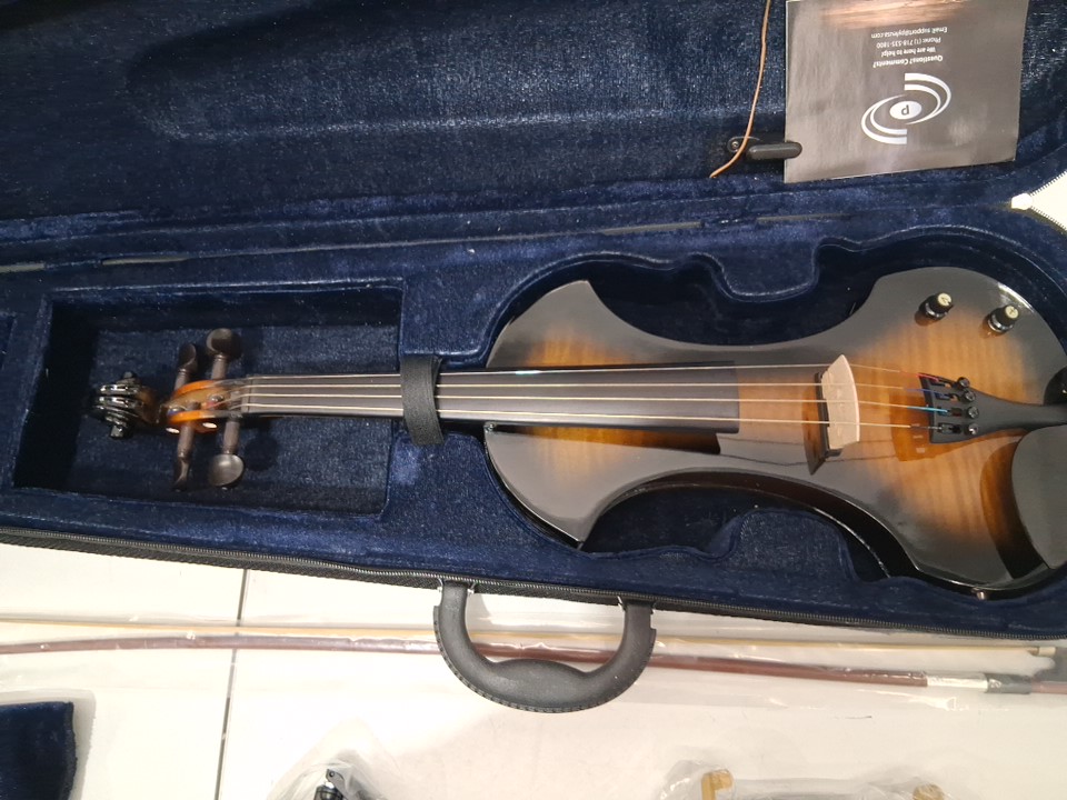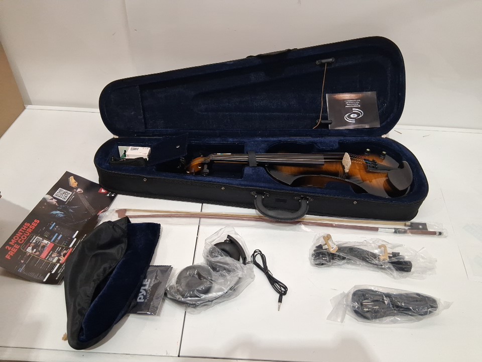 pyle full size 4/4 solid wood silent electric violin kit with hard case, bow, ebony fittings, headphones & digital tuner (model: pegvln33)