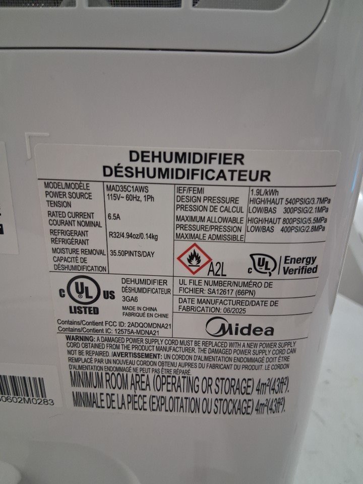 MIDEA EASYDRY DEHUMIDIFIER with AUTO SHUT-OFF, TIMER & WHEELS - 3000sQ.FT, 35PT - WHITE (MODEL: MAD35C1AWS)