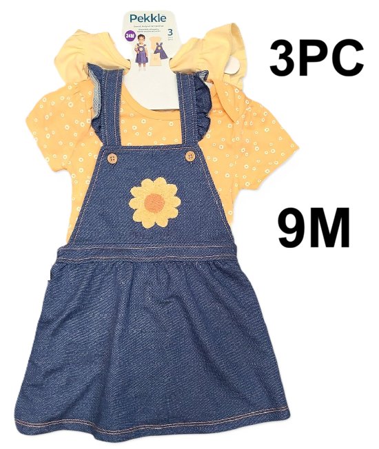 3pc pekkle infant girls denim sunflower dress and tops - 9 months - blue/yellow (model:1769900)
