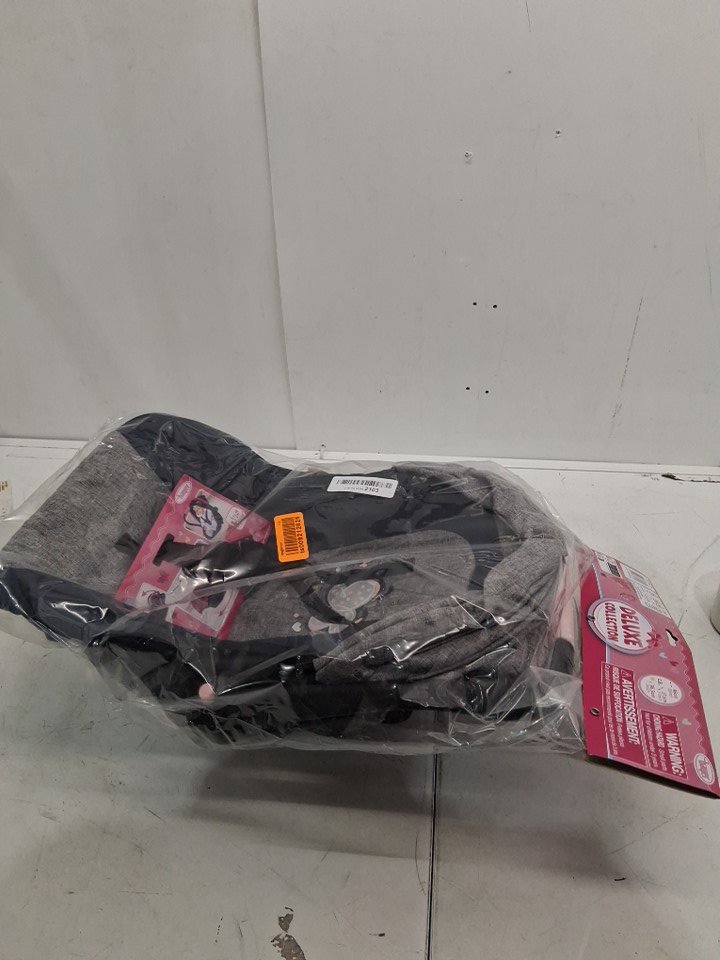 Bayer - Deluxe Doll Car Seat WITH Safety Belt, Sun Canopy, Accessories for Baby Dolls - Dolls up to 18”- GREY PINK BUTTERFLY (MODEL: 67927AA)