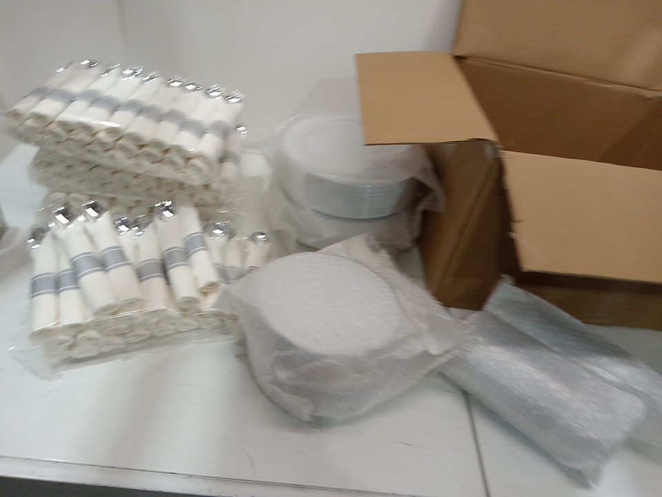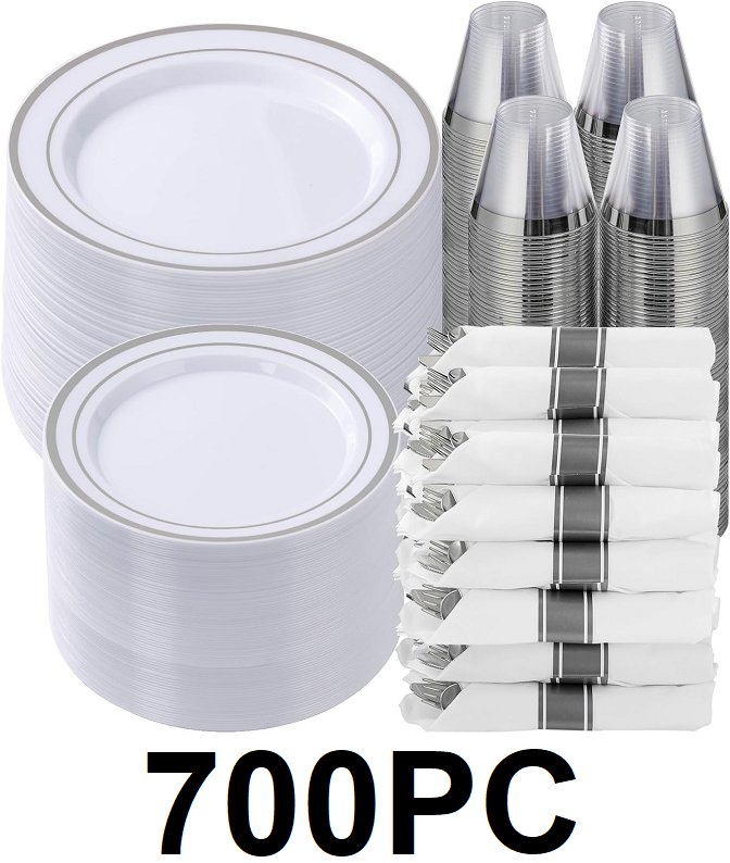 700pc Plastic Dinnerware Set with pre rolled cutlery - silver/clear