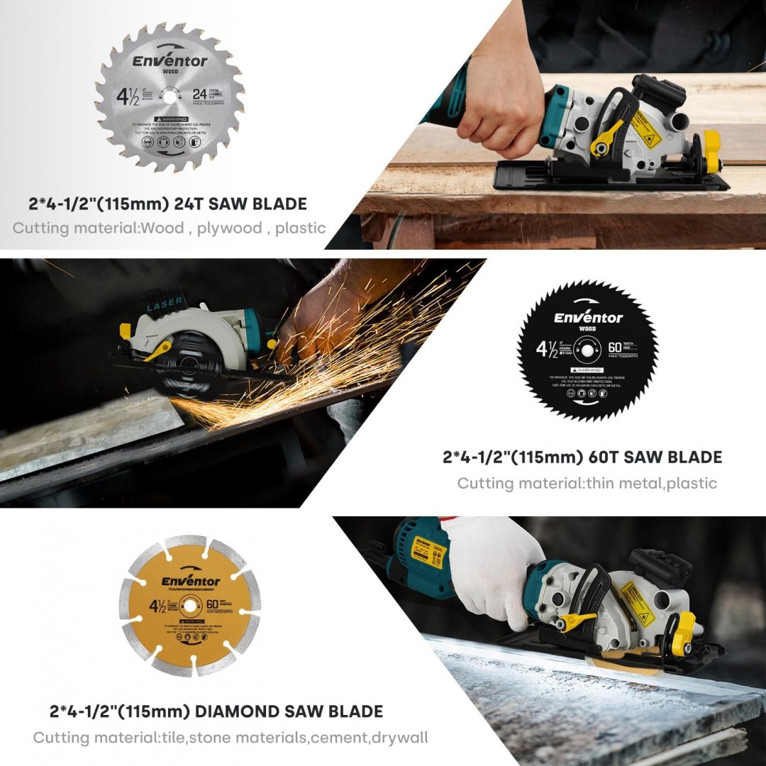 Includes 6 assorted saw blades: - x2 24T Carbide Blade for woodcuts - x2 60T HSS Blade for wood and soft-metal cuts - x2 Diamond Blades for tile cuts The photos shown were taken from the original first listing that helped us indicate colour/model. The item you will be receiving will be factory sealed.