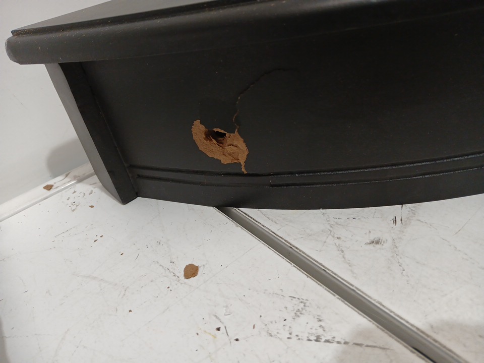 the table has some signs of previous use with a hole in the side of the top piece of the table. see images.