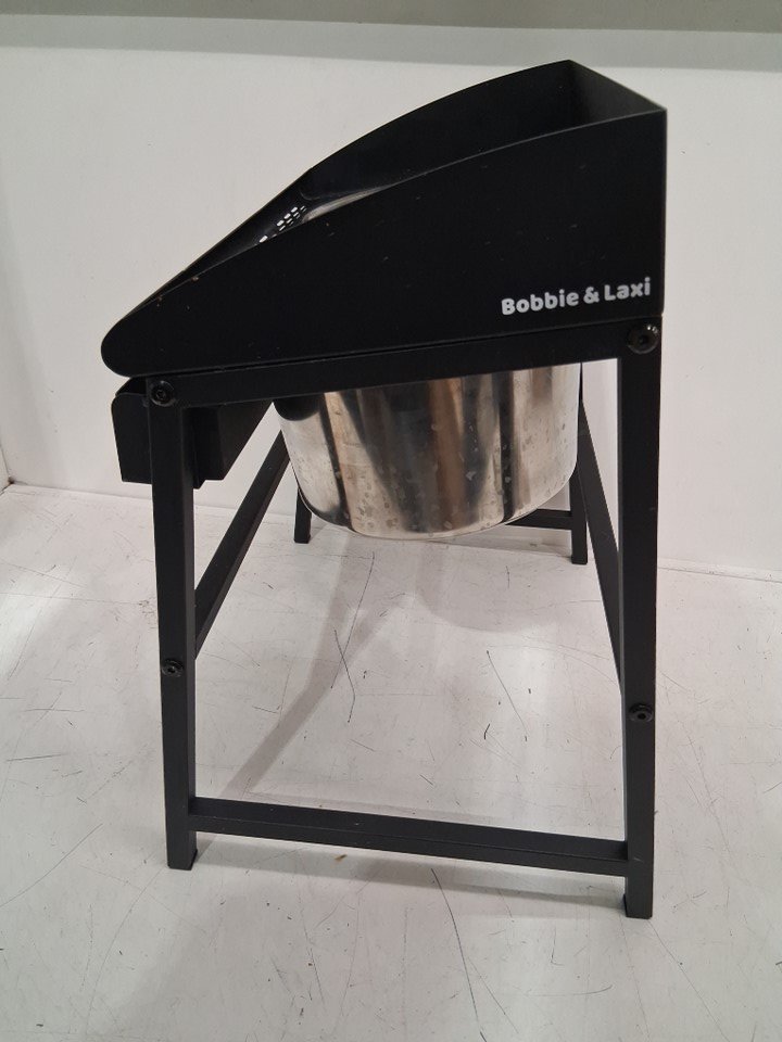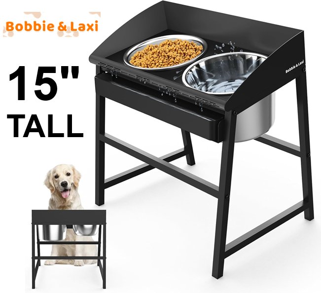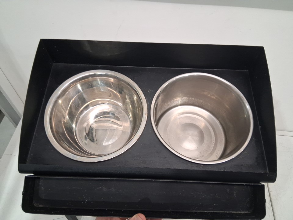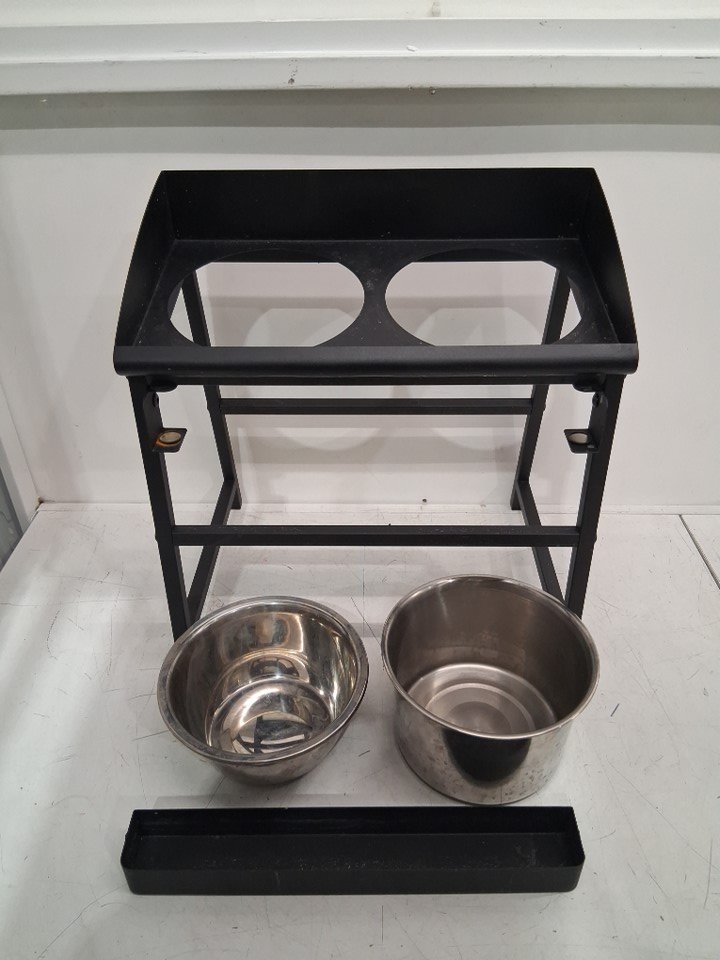 There are dog food and water stains from previous use, and the bowls and stand will need to be wiped down before use.