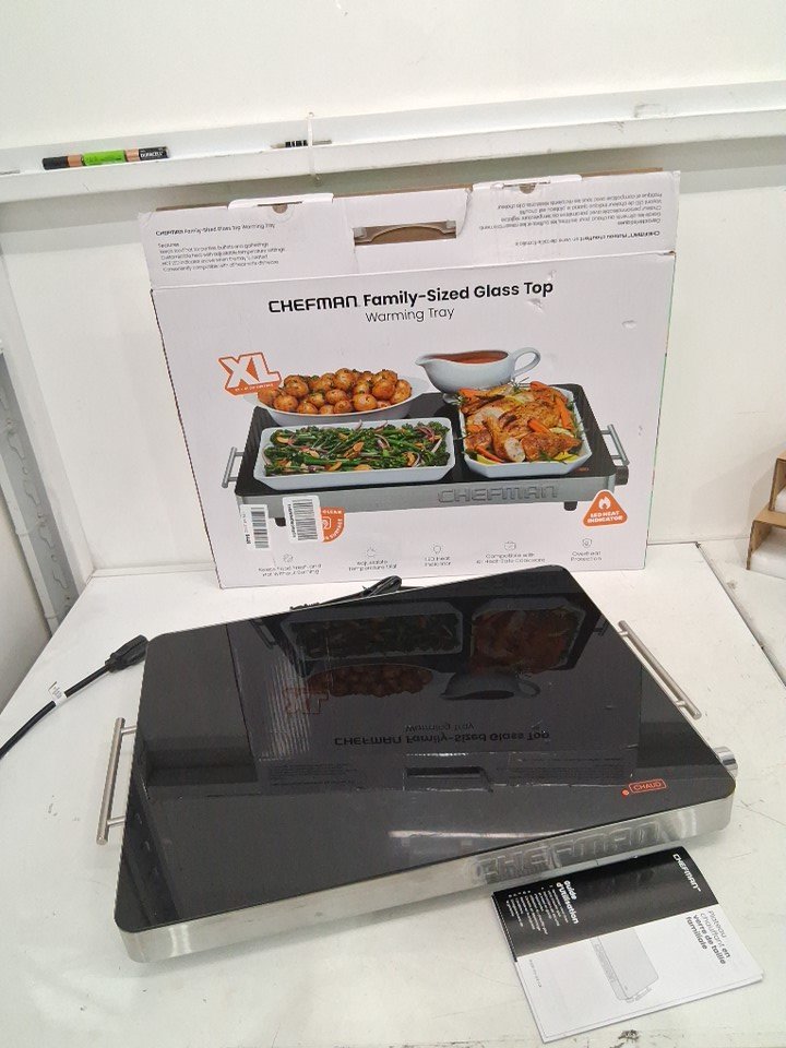 CHEFMAN FAMILY SIZE GLASSTOP WARMING TRAY WITH TEMPERATURE CONTROL - 21" x 16" - 450W - BLACK/STAINLESS STEEL (MODEL: rj22-tc-v3-ca)
