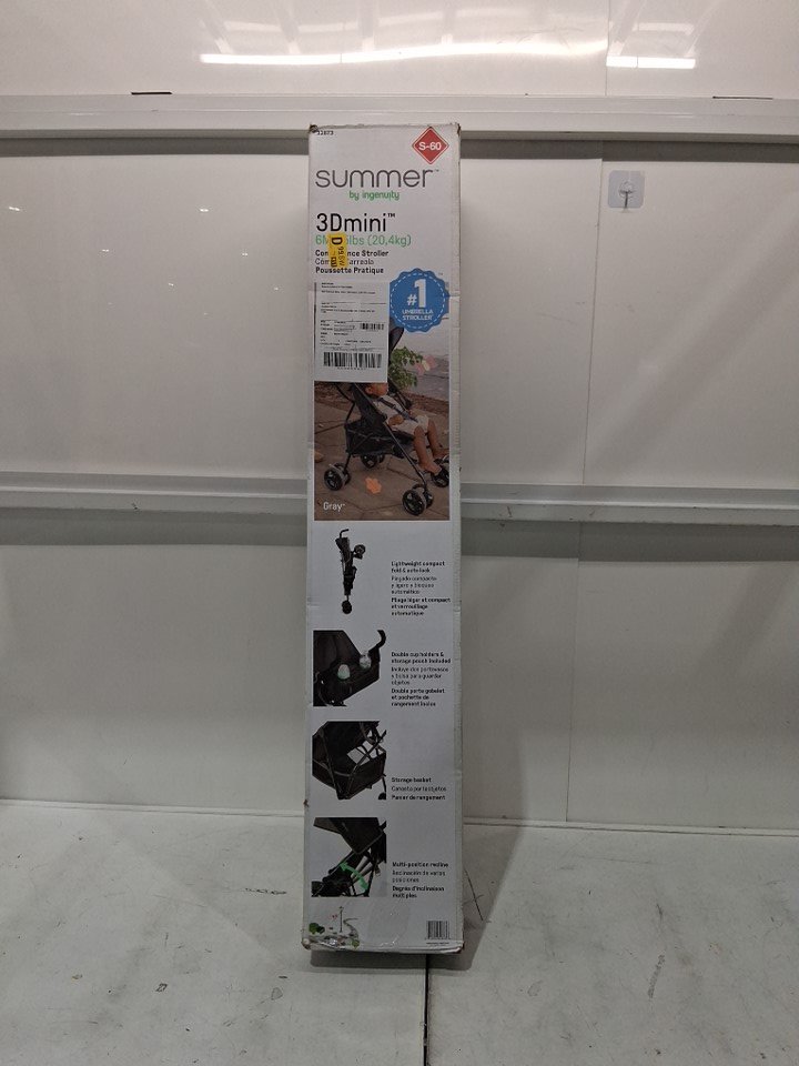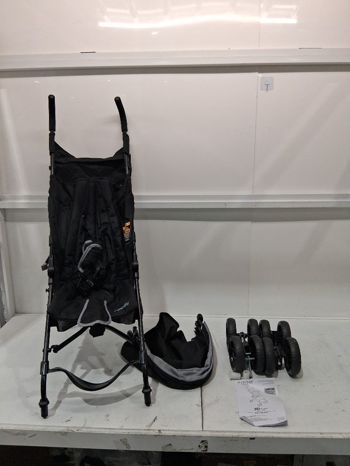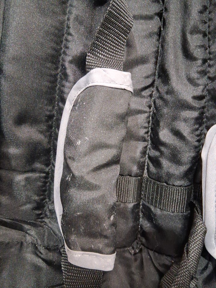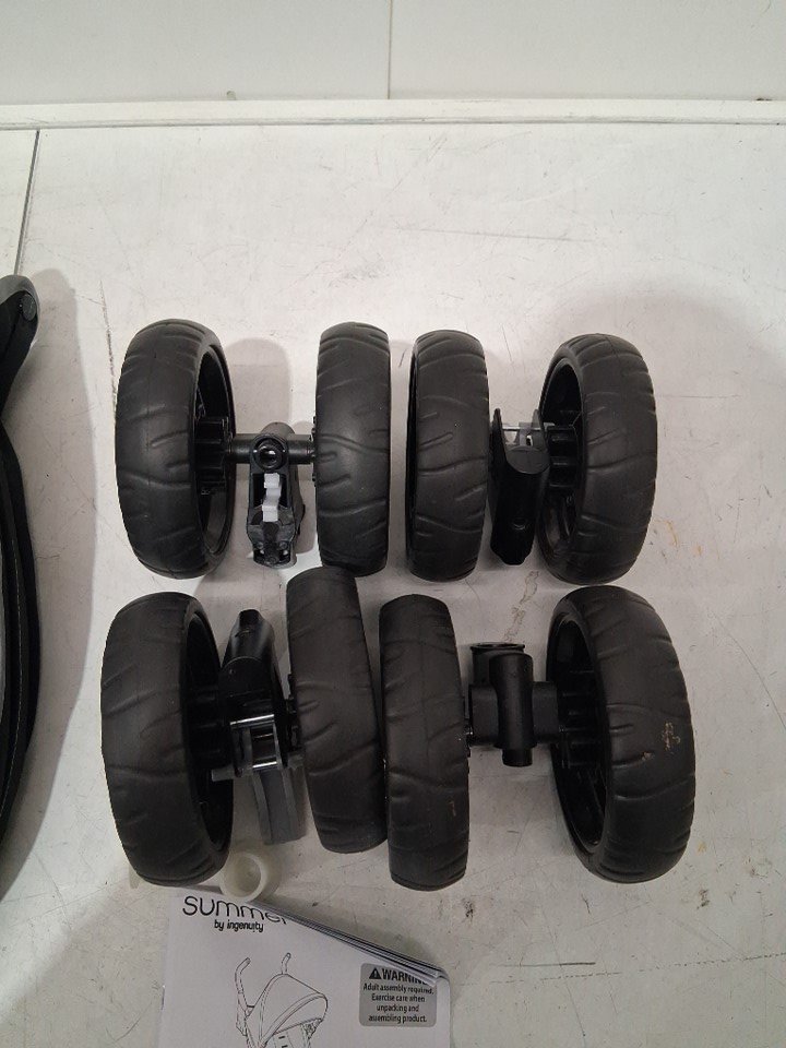 item has some white what looks to be water spots on the fabric buckle piece and a bit of debris on wheel ( see photos)
