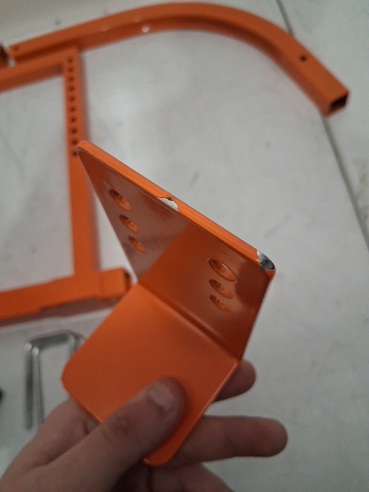 There are a couple small paint chips on the edges of the brackets and one scratch/scuff mark on the "U" shaped piece due to shipping and handling.