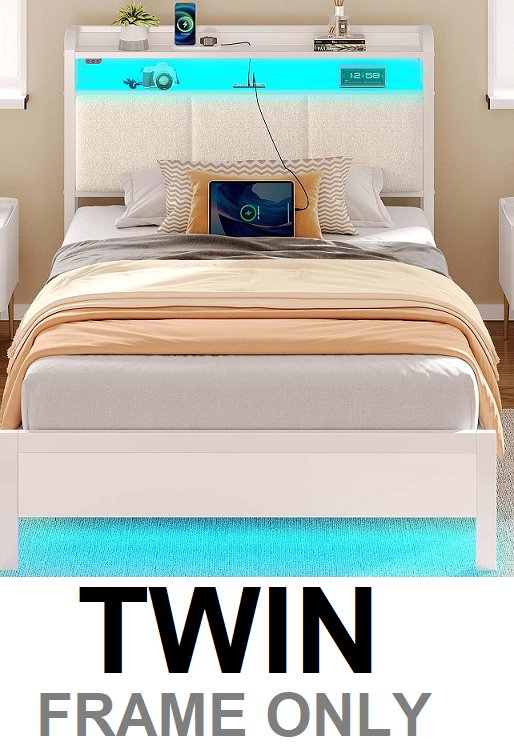 Rolanstar bed frame with charging station, led lights heavy duty metal - Twin - White/beige (Model: bf008-v2n-ow-t-rr)