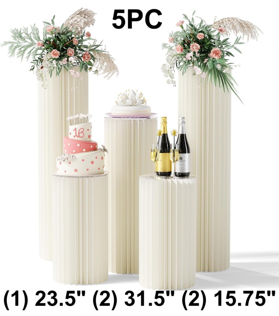5PC Portable Foldable White Cylinder Pedestal Display Stands For Weddings - (1) 23.5" (2) 31.5" (2) 15.75" - White