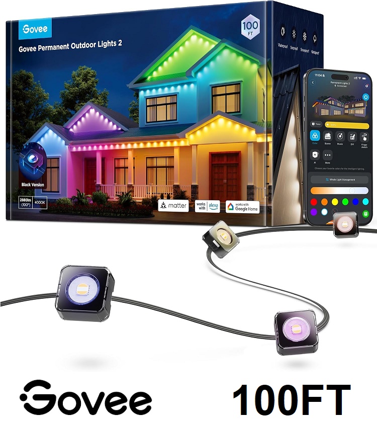 Govee Permanent Outdoor RGBIC Smart Lights - 100FT - 4000K - Works with Alexa and Google Home - Black (Model: H805A)
