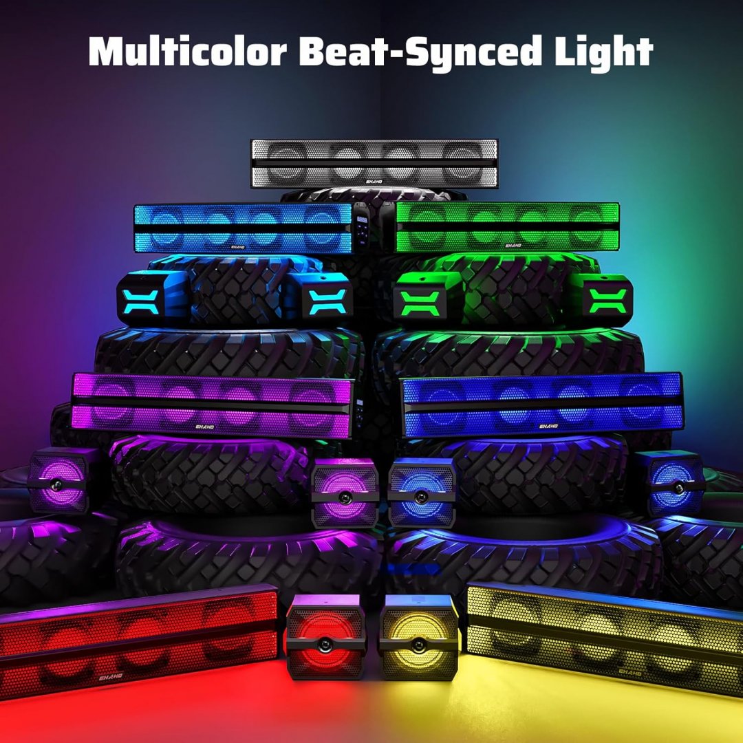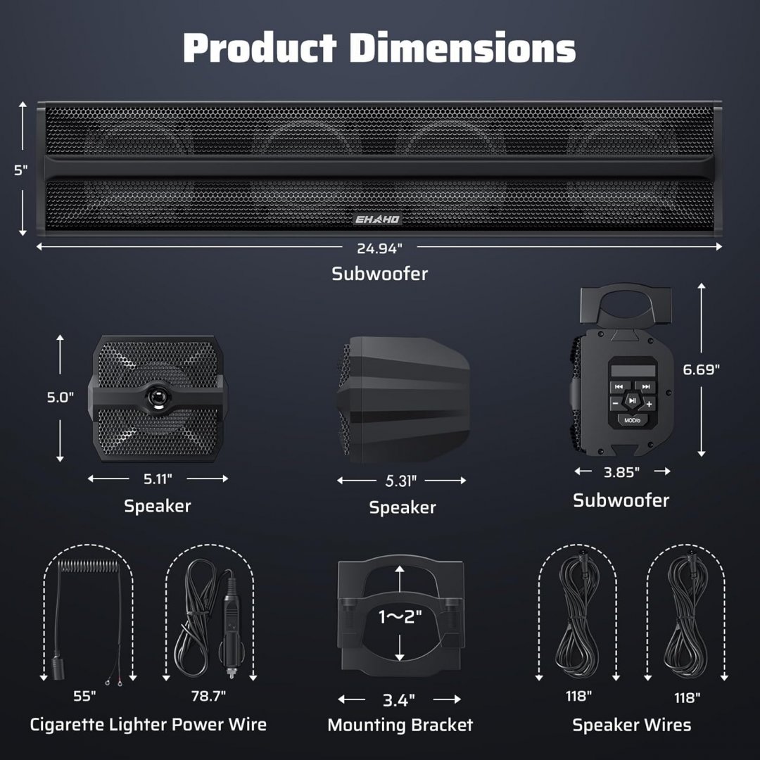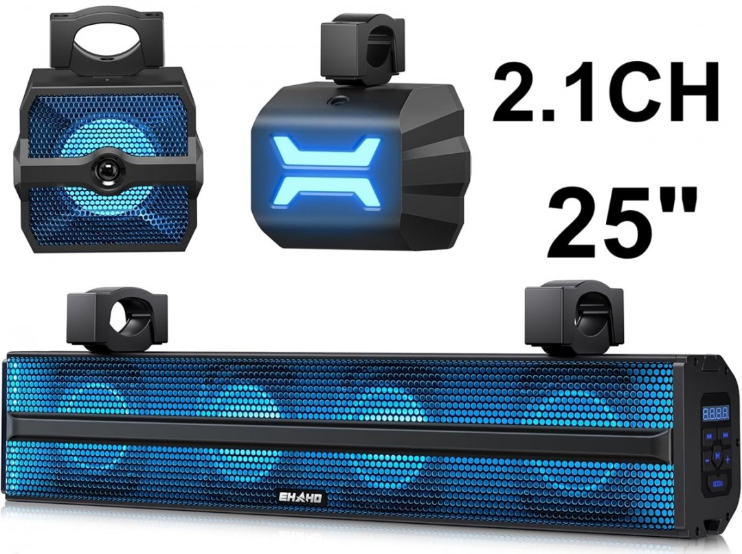 3pc ehaho 2.1ch stereo utv bluetooth subwoofer sound bar & speakers for atv, golf cart, boat - 25", fits vehicles with 1-2" roll bar - rgb lighting - (model: mt6221)
