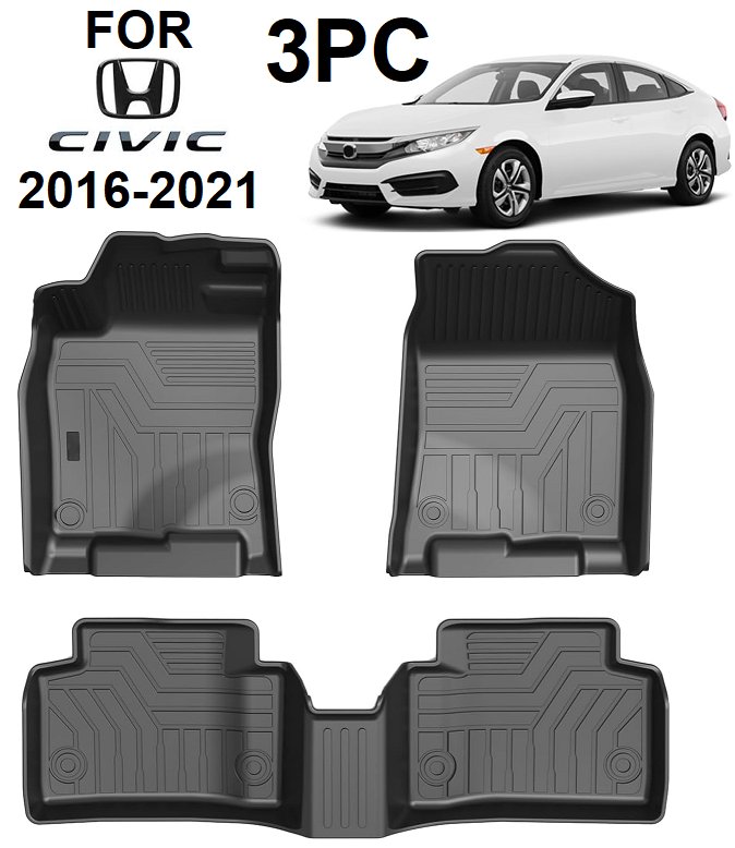 3pc FIILINES all weather tpe Floor Mats for Honda Civic Sedan/Hatchback/Type R (2016-2021) - Waterproof, Durable - Black