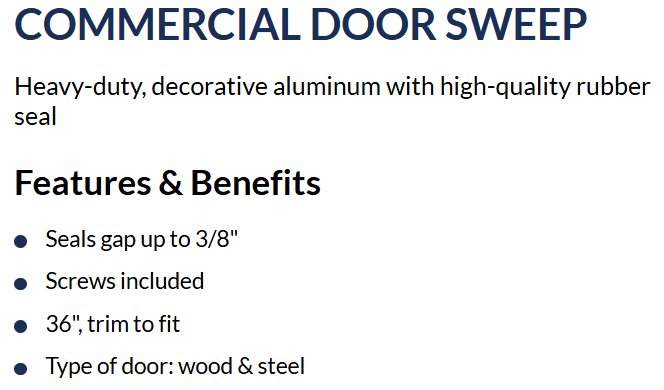 CLIMALOC HEAVY DUTY TRIM TO FIT COMMERCIAL DOOR SWEEP FOR GAPS UP TO 3/8" - 36" LENGTH - (MODEL: CF20536)
