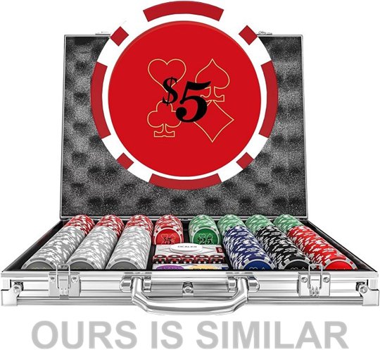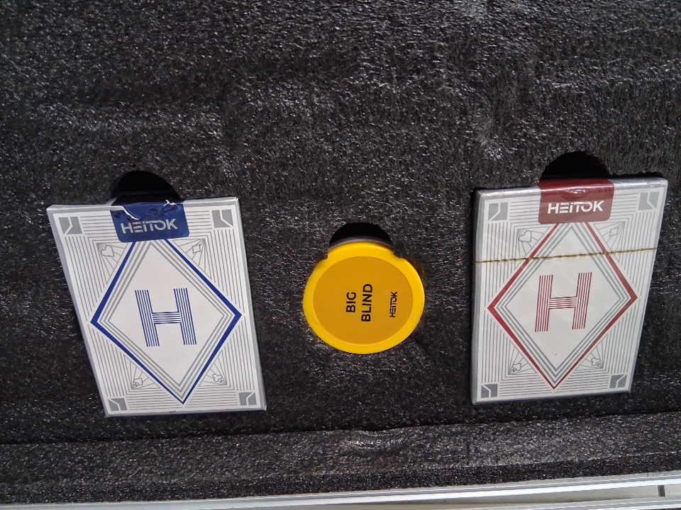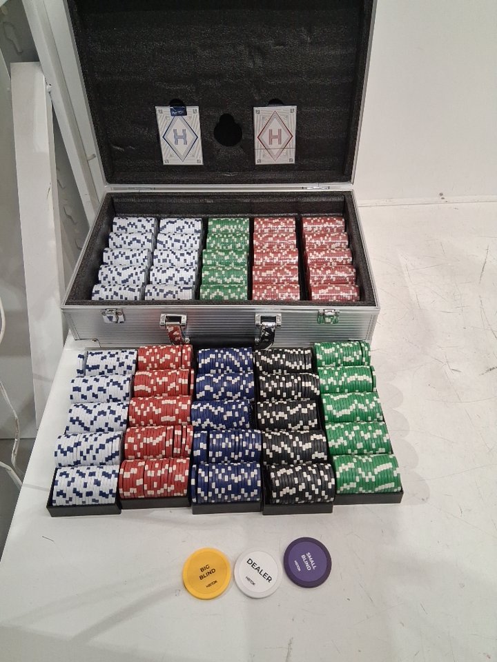 Please note: • The set shows signs of previous use with one of the decks being opened and the top set of chips is no longer sealed, see photos. • The case's back panel has slipped out and is peeling, see photos.