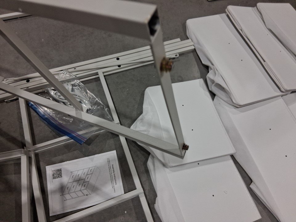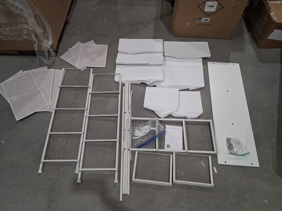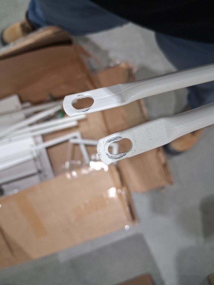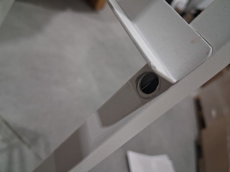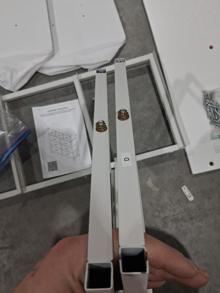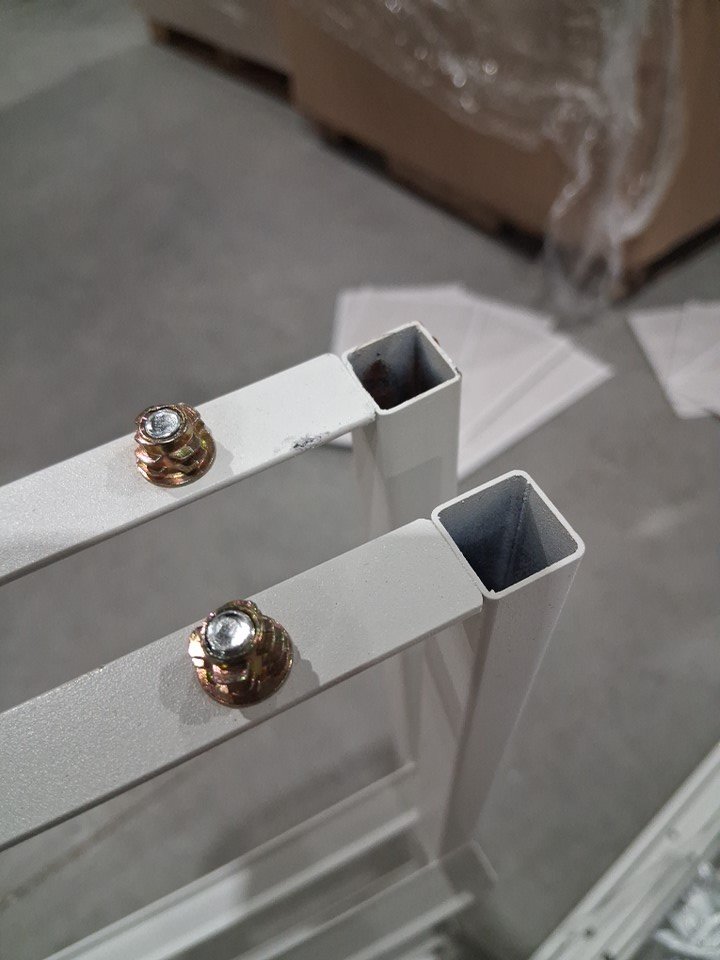 item has some light scuffs from previous assembly as well as some of the dowels have been pulled out of the wood but can be screwed back in