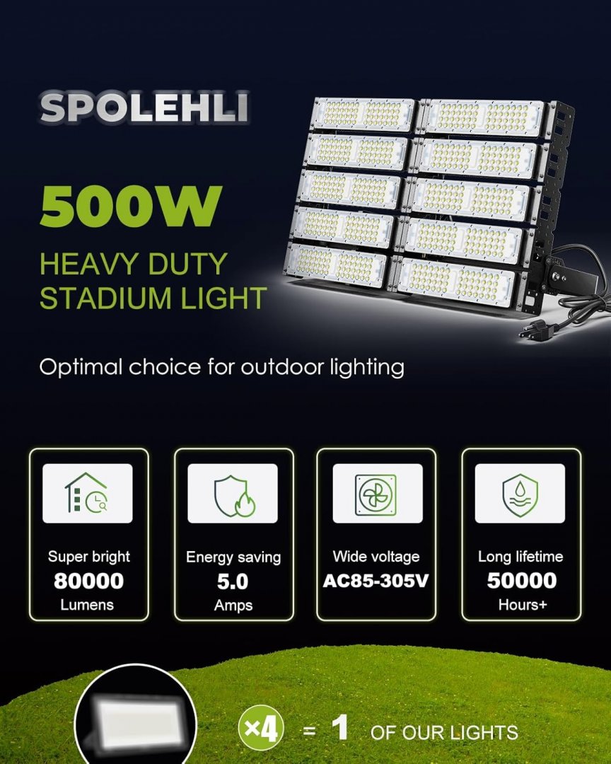 SPOLEHLI LED STADIUM FLOOD LIGHT 80000LM - 85-305V - IP66 Waterproof - 500W - BLACK(MODEL: ‎FBA-SYN-134h)