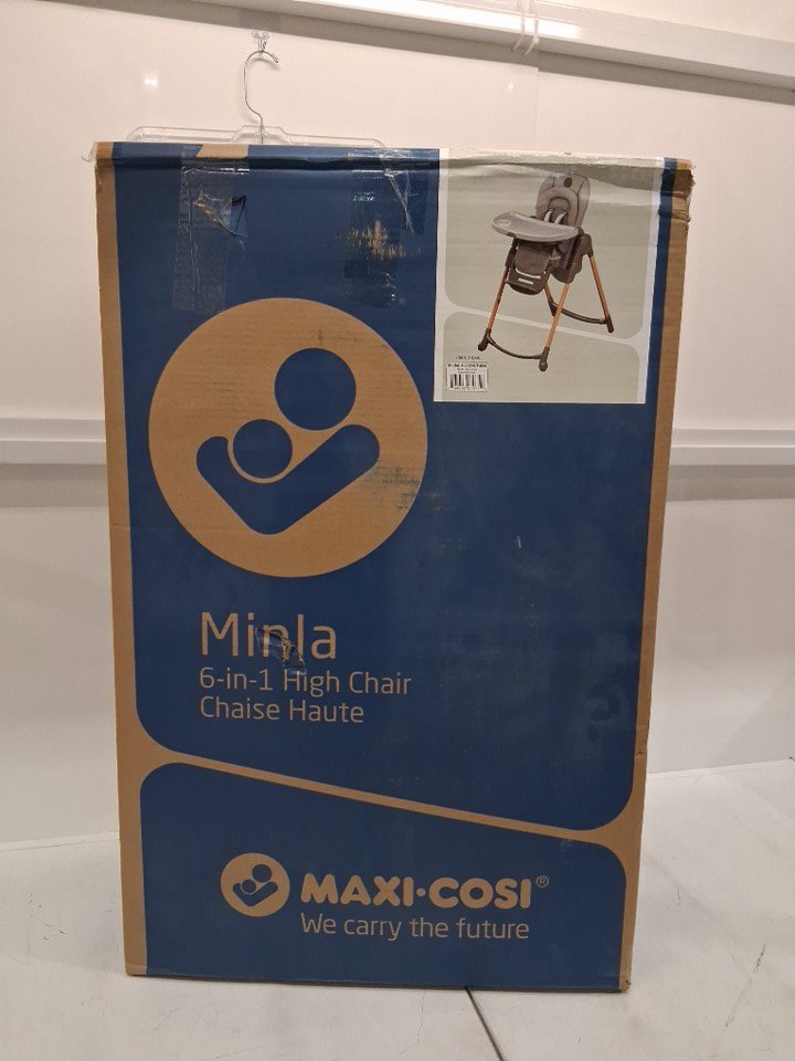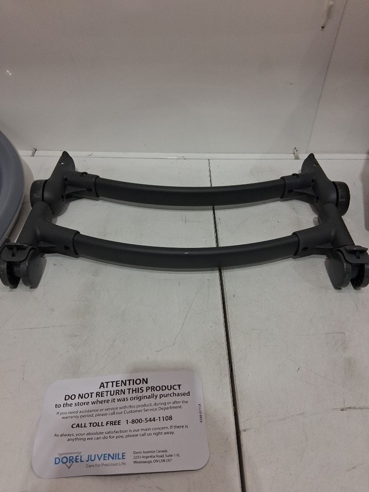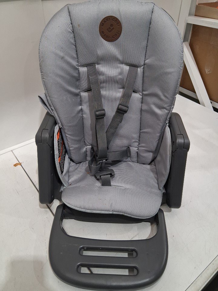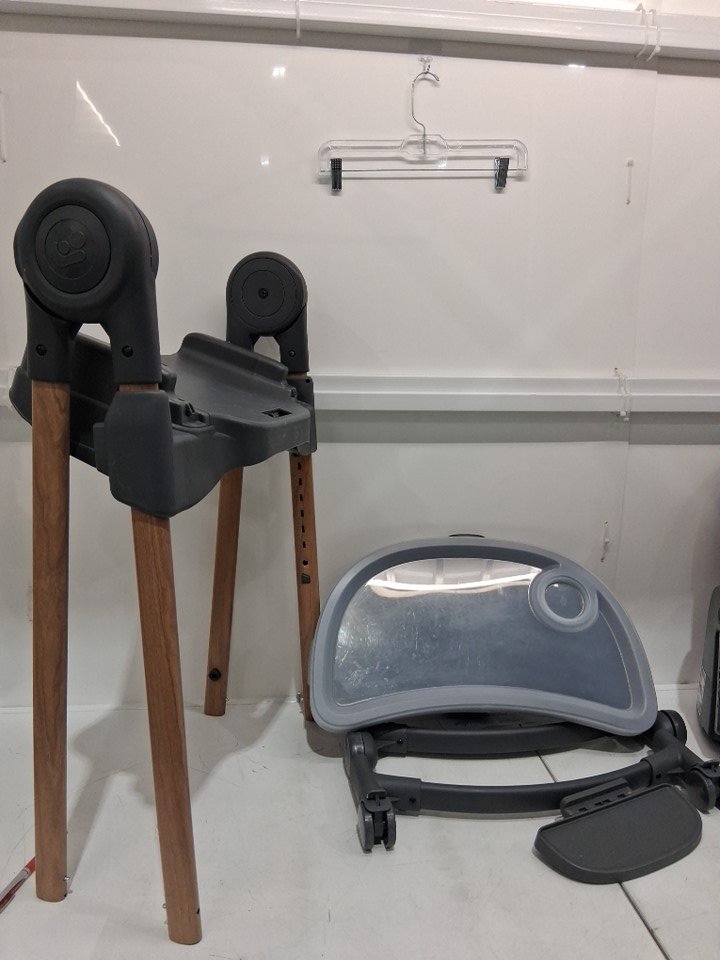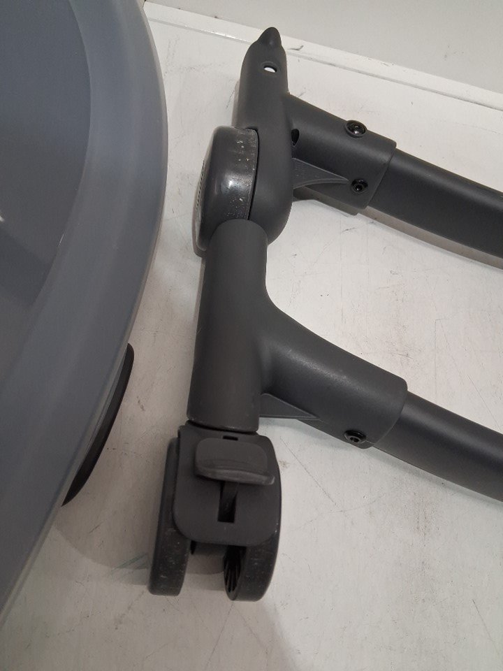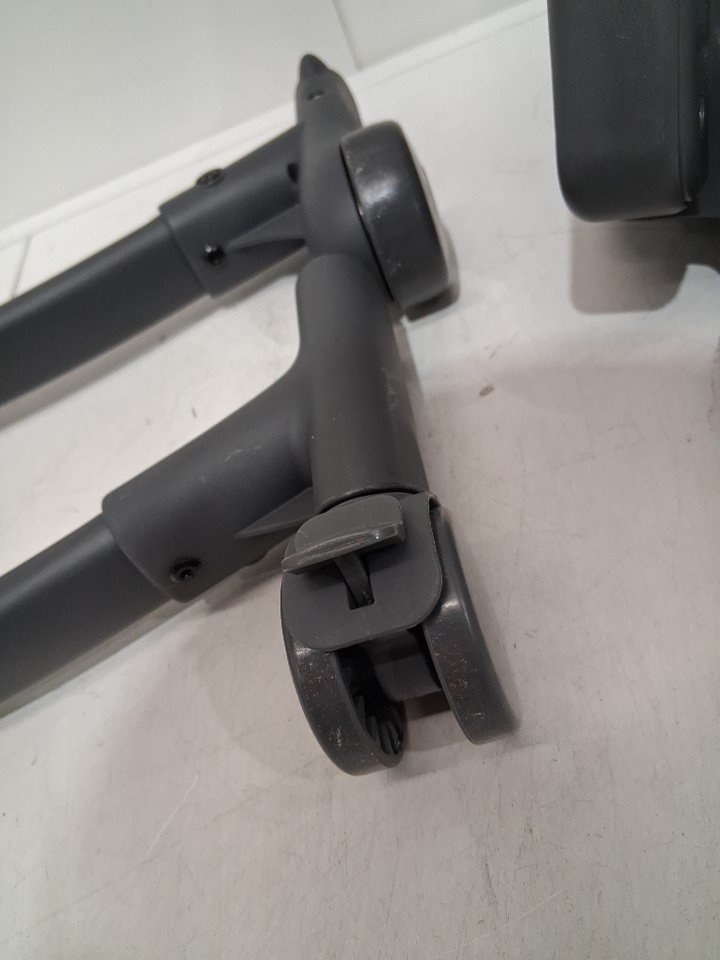 Missing booster seat and smaller grey insert. Signs of previous use indicated by stains and debris on the wheels and main chair insert. See image details.