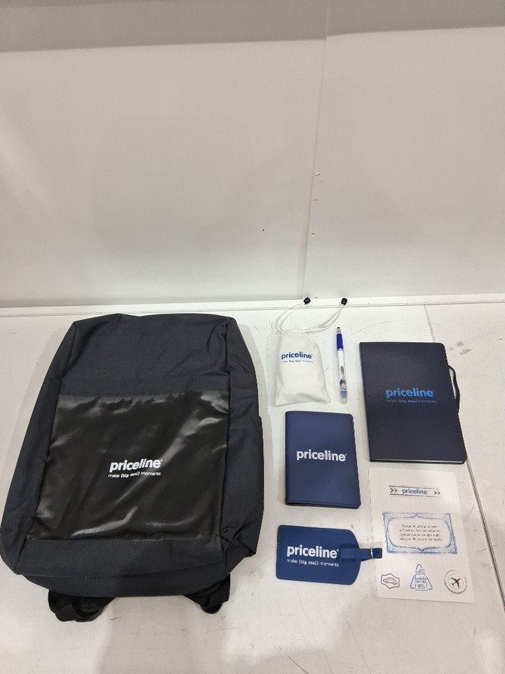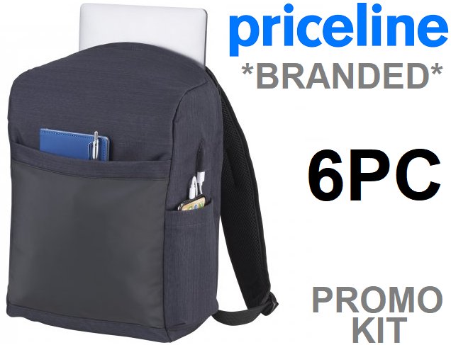 6pc leeds *priceline branded* reyes travel laptop computer backpack promotional kit - notebook, pen, travel tag, wallet, interchangeable universal wall plug - blue