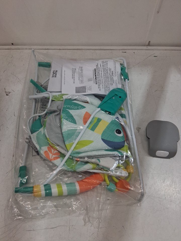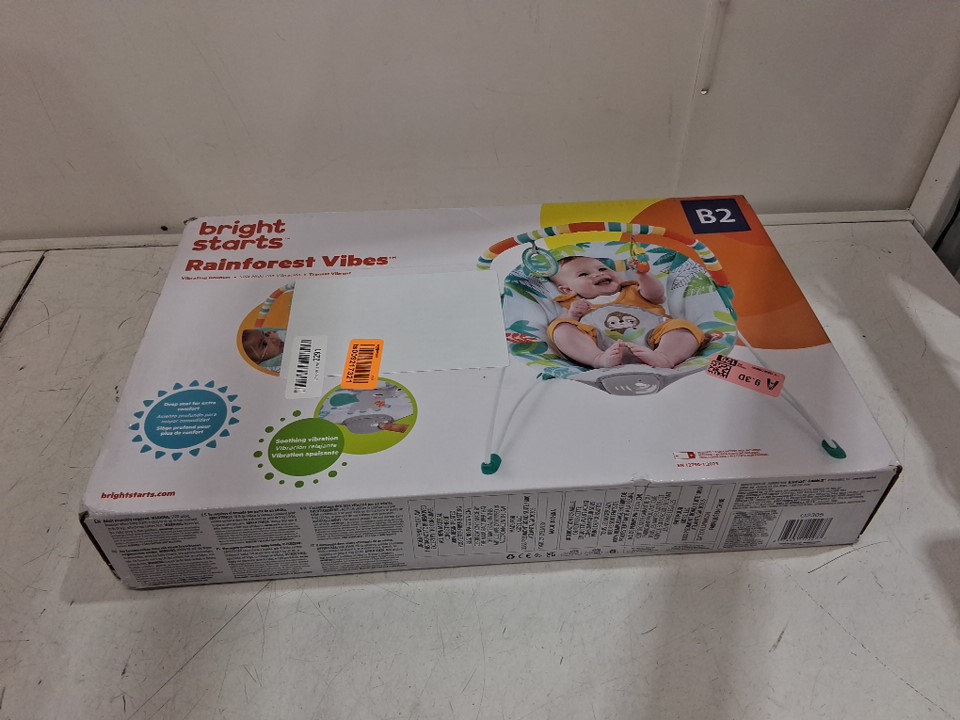 BRIGHT STARTS RAINFOREST VIBES PORTABLE 3-POINT HARNESS VIBRATING BOUNCER WITH TOY-BAR - RAINFOREST VIBES (MODEL: 12227)