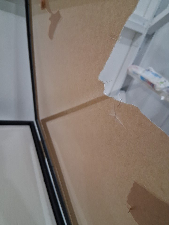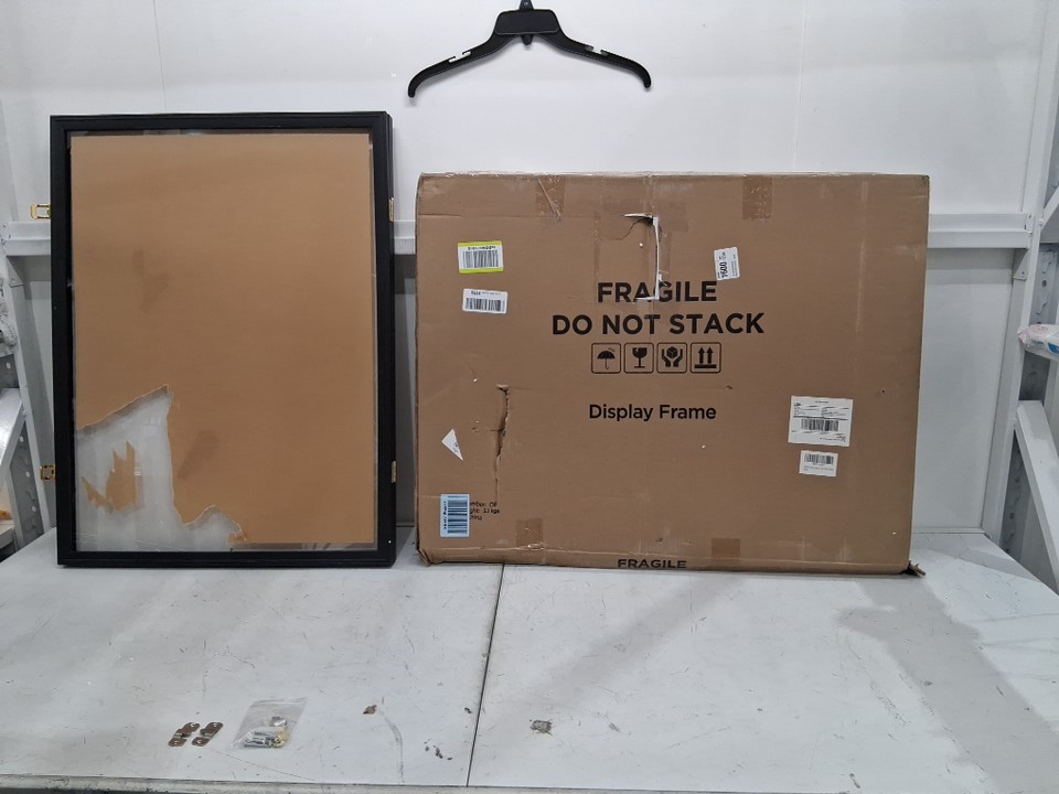 Front frame has a small nick in wood, Plexiglass has some small cracks, and the back has a small dent (See photos)