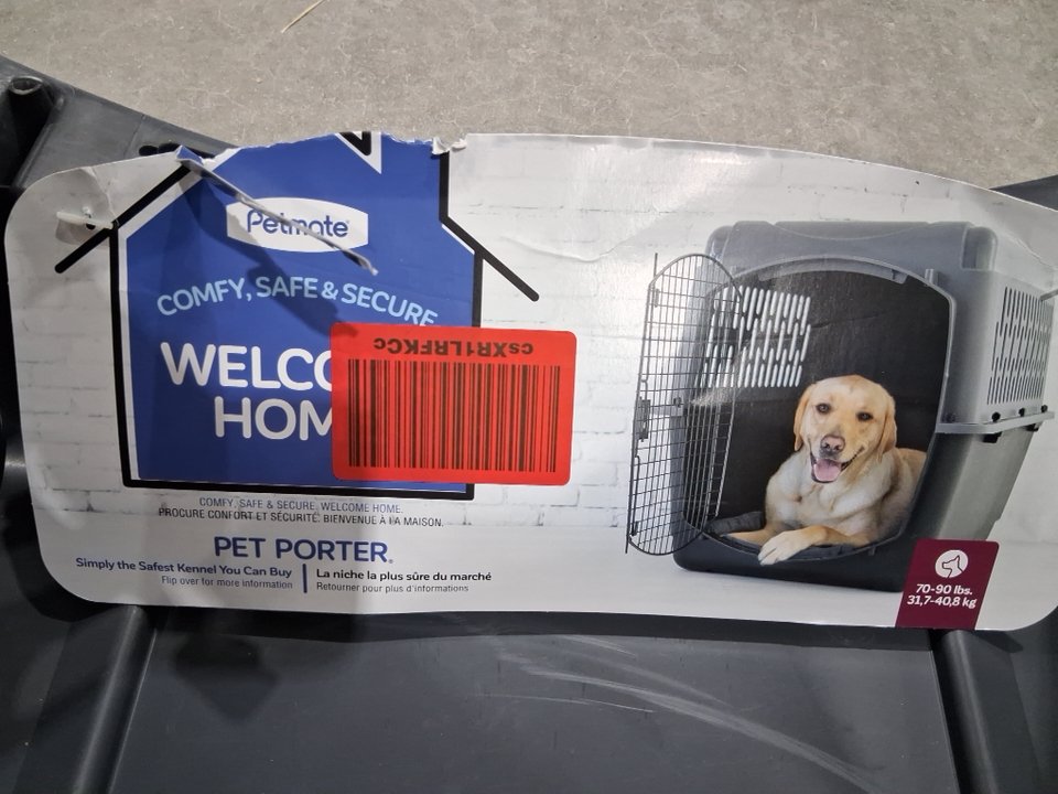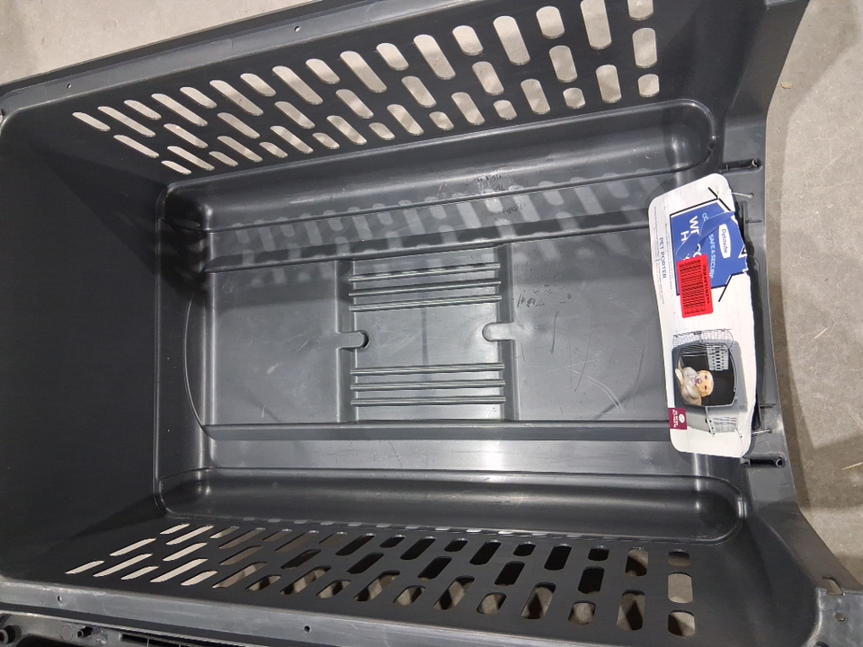 Please note: • The kennel shows signs of previous use with scuffs and smudging around the kennel, see photos. • The door is missing and will need to be replaced. Replacements can be found at https://www.petmate.com/collections/replacement-parts • There is a small chip along the front edge of the kennel, see photos.