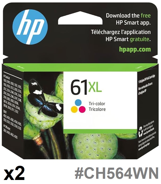 2 HP 61XL Ink Cartridges for Select DeskJet, ENVY, and OfficeJet Printers - Tri-Colour Cyan, Yellow, Magenta (Model: CH564WN)