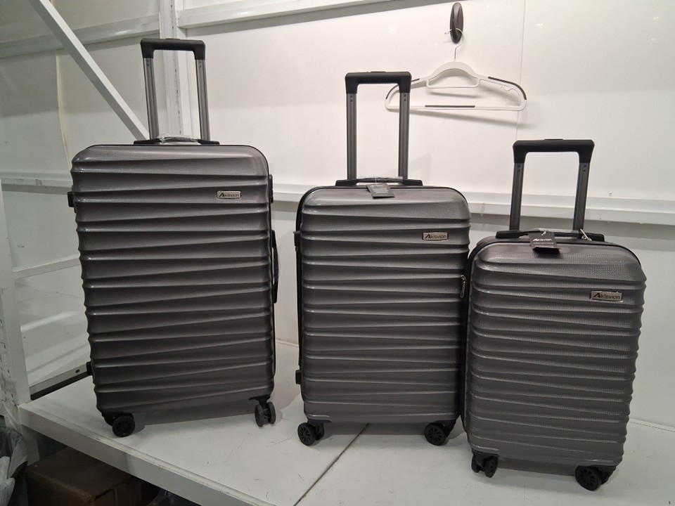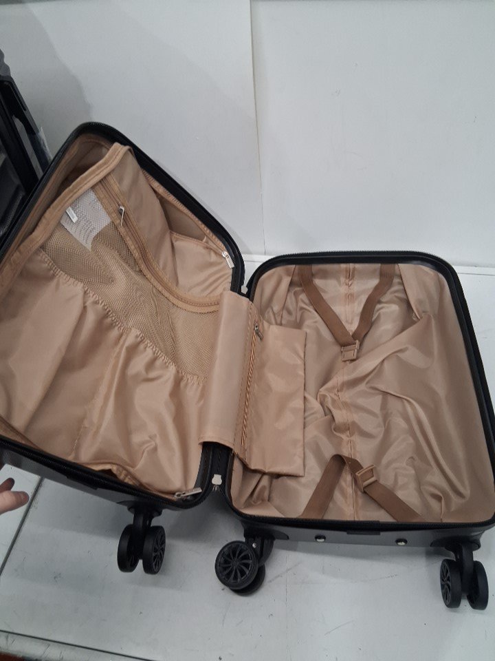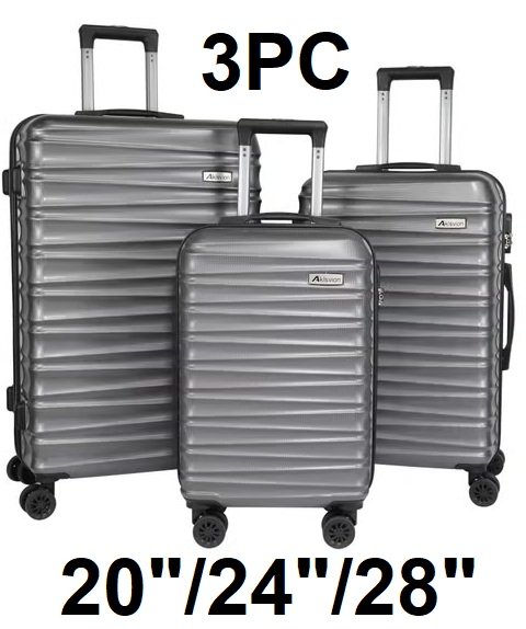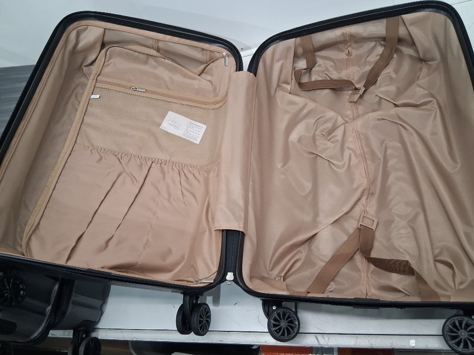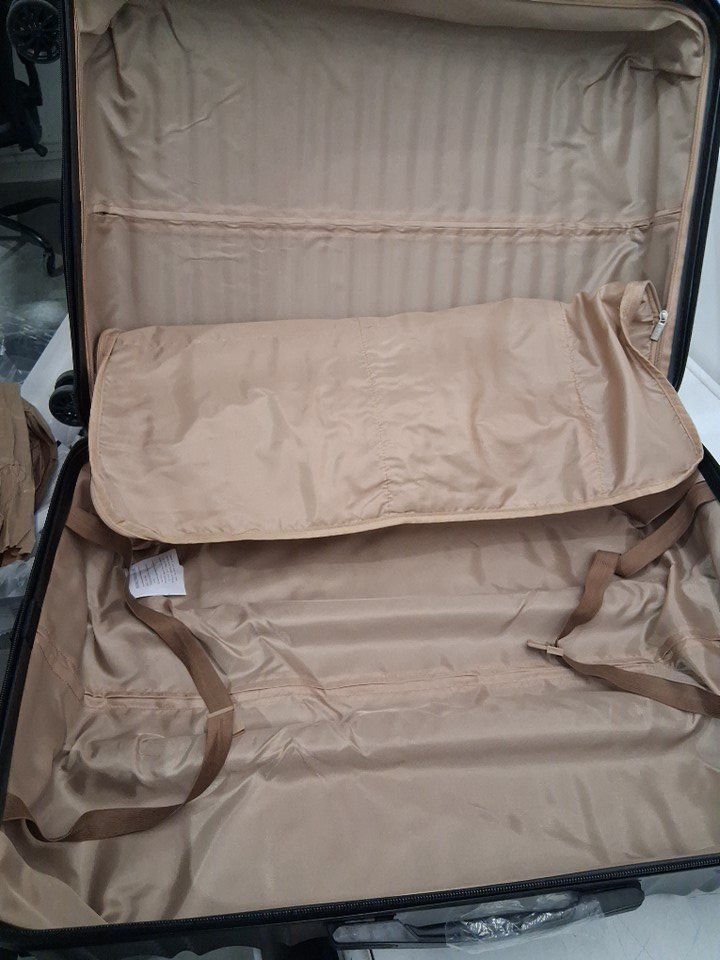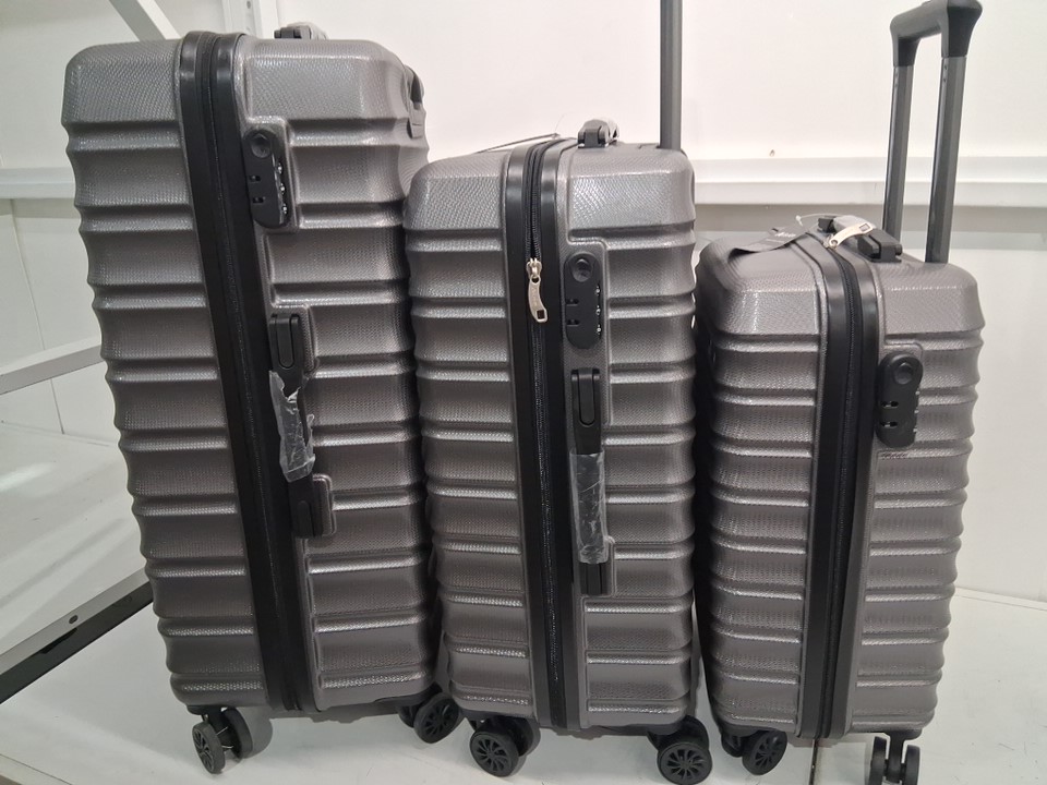 28" luggage has signs of use, wheels have dirt discoloration and a string wrapped in axle, one out of two zipper tabs is broken and part of zipper is busted at bottom. Other two luggage bags are unused.
