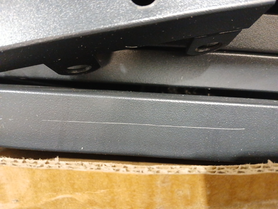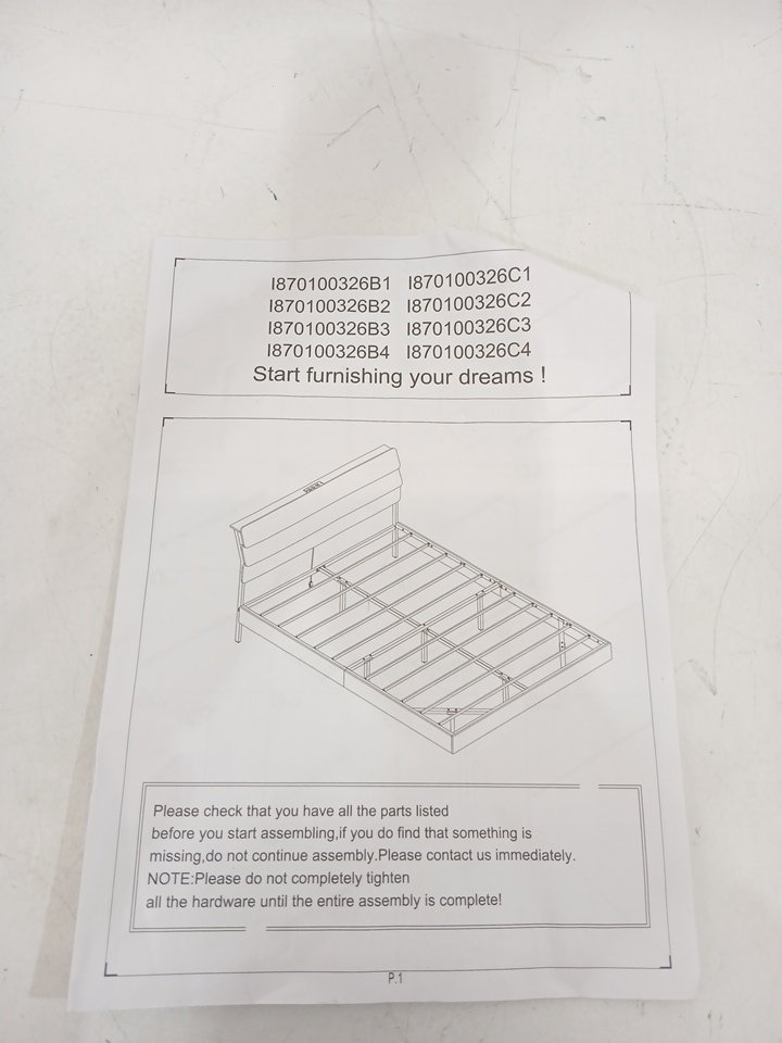 The headboard is different than the cover image; it doesn't have the vertical bar in the middle and there aren't gaps between the horizontal bars in the headboard (see images). This item has previous assembly marks, scratches, and the headboard has damage to its edges. Additional hardware may be required for assembly