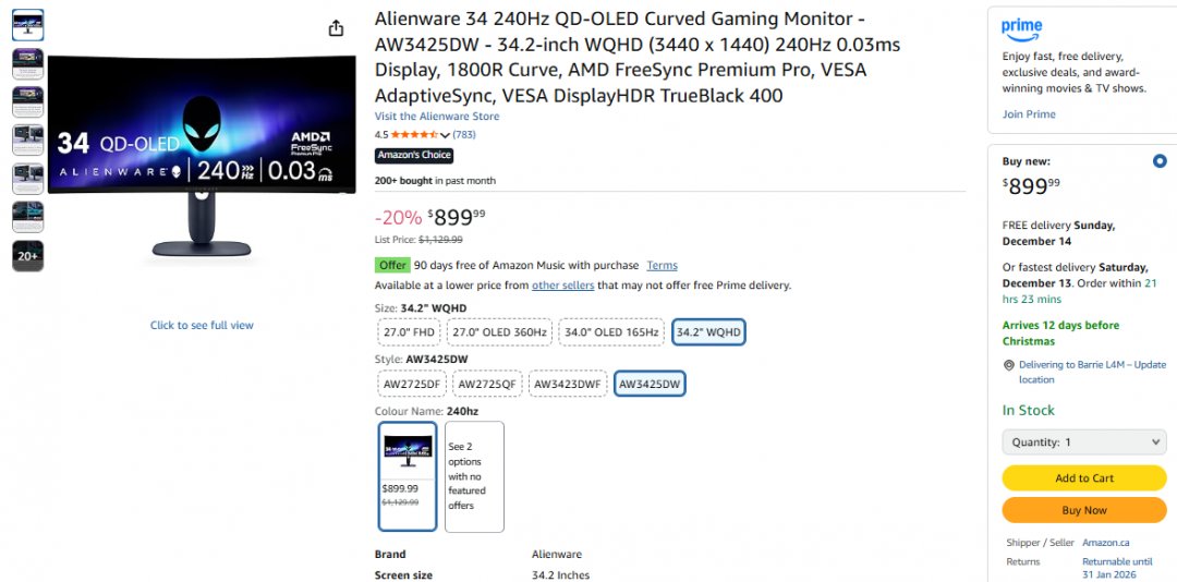 alienware curved gaming monitor - 34" | qd-oled | 240hz | 0.03ms delay | 1800r | trueblack 400 - navy blue - (model: aw3425dw)