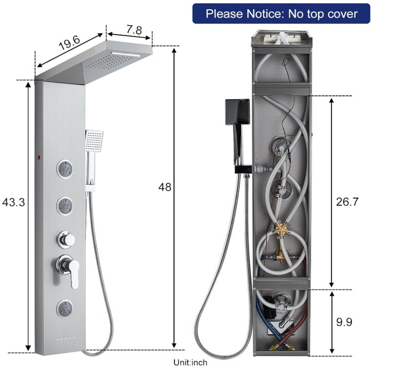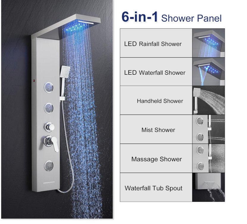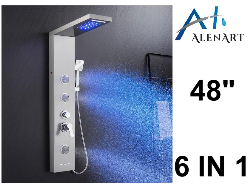 alenart 6 in 1 LED shower panel tower system with rainfall, jets and handheld with tub spout- 48" tall -brushed nickel (model: lft1049)