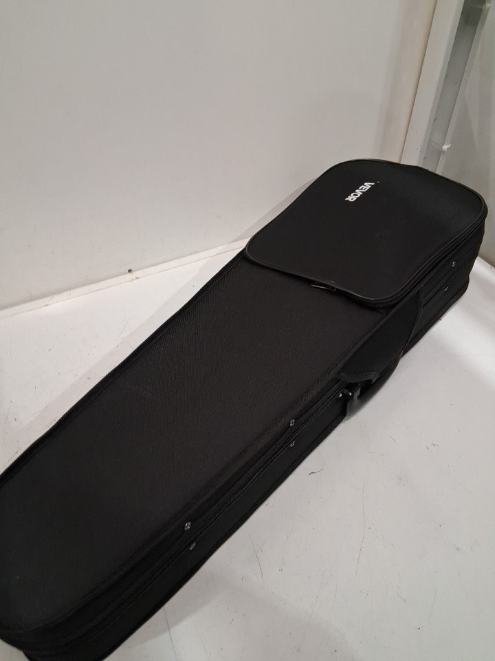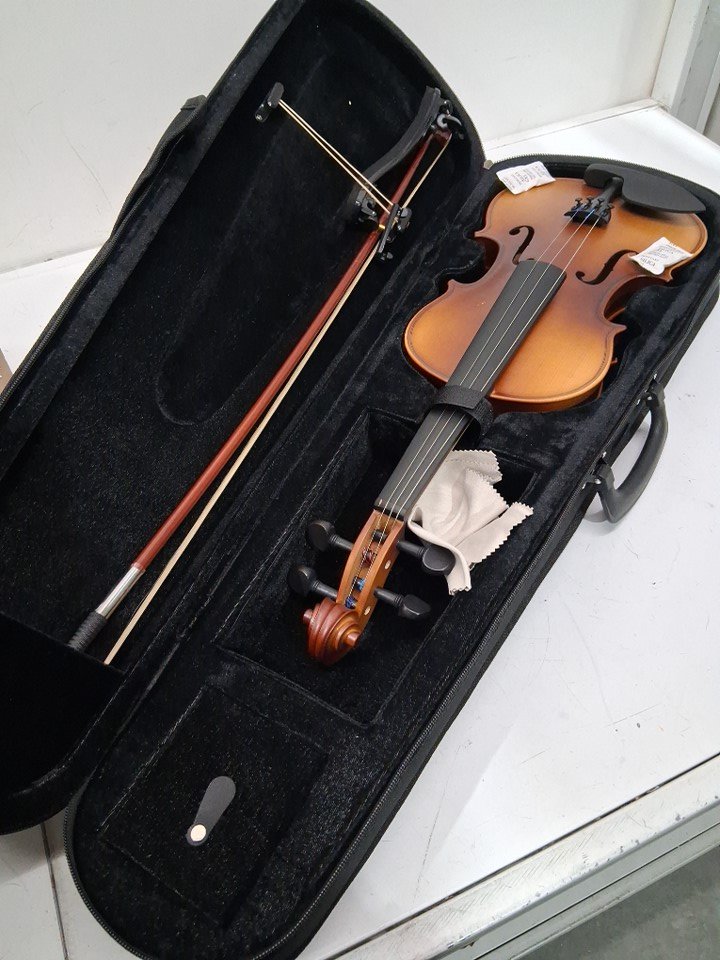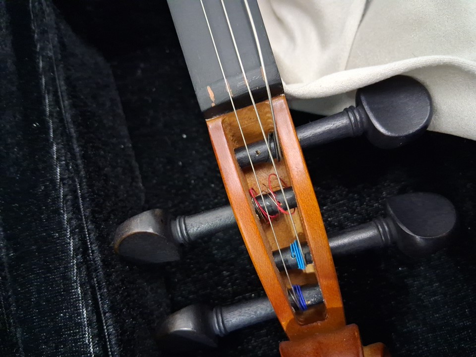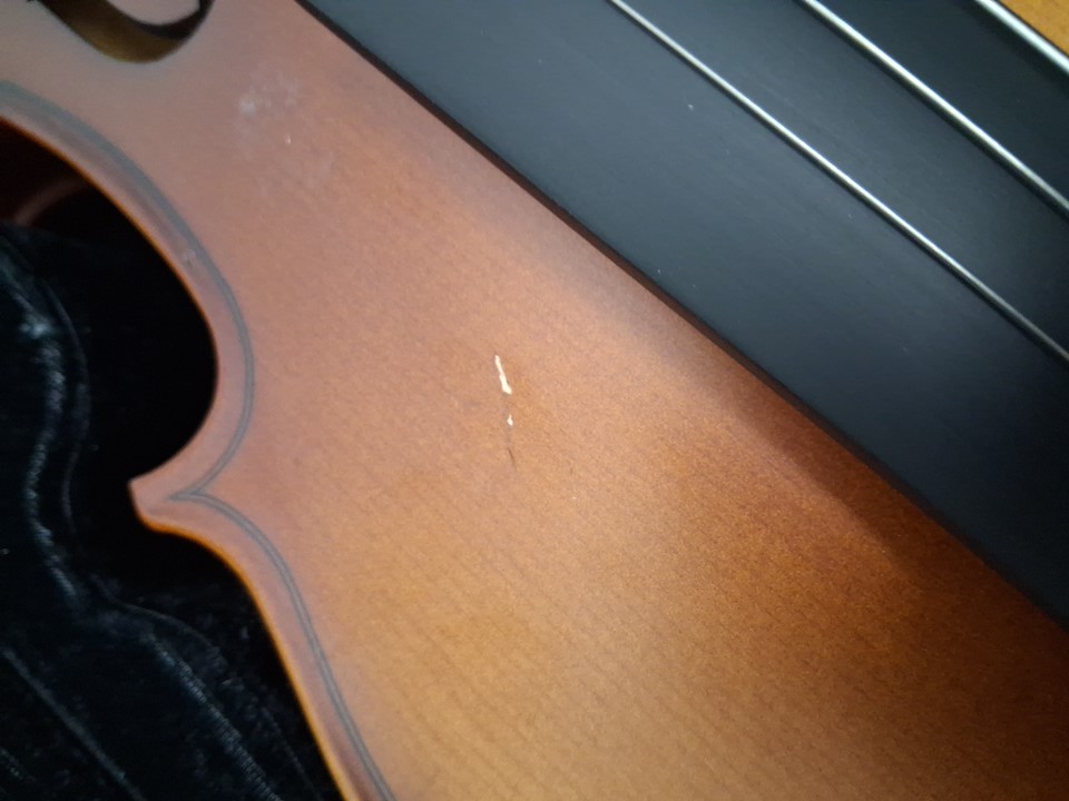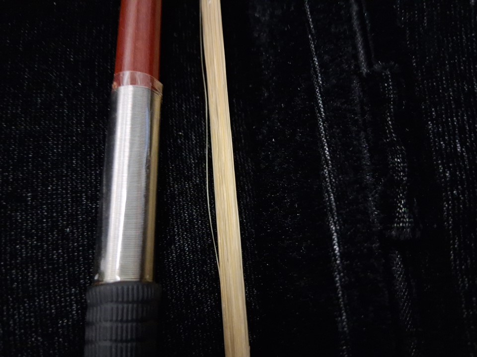 One string is broken- there is some distress at the top of the neck, small chip on body (see photos) The bow has some broken hairs from prior use