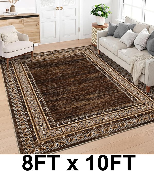 MODERN BORDERED WASHABLE AREA RUG - 8FT X 10FT - BROWN