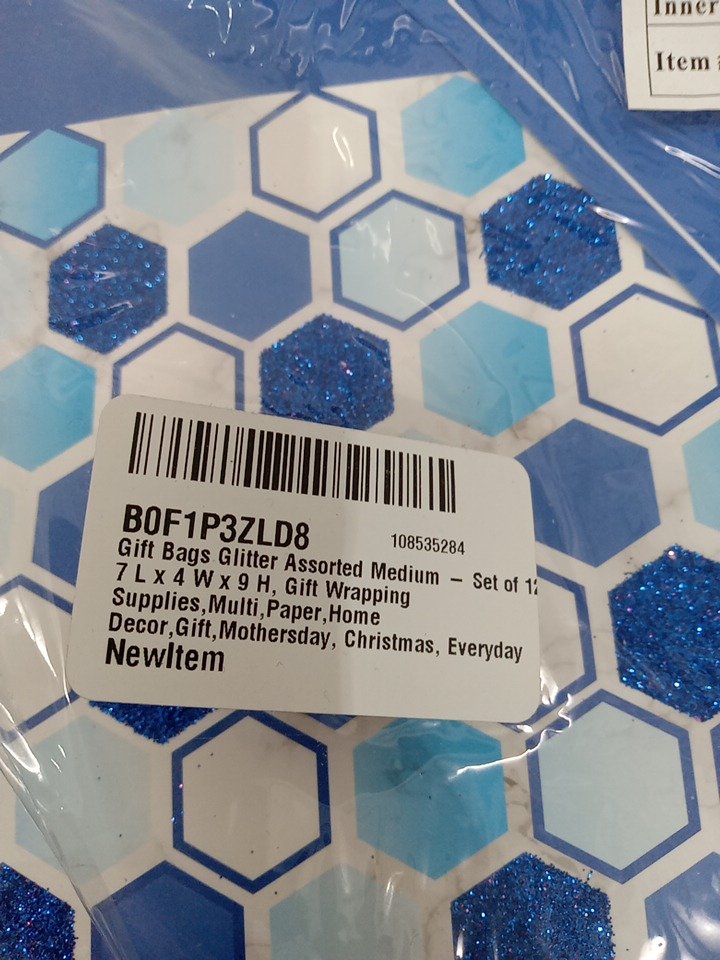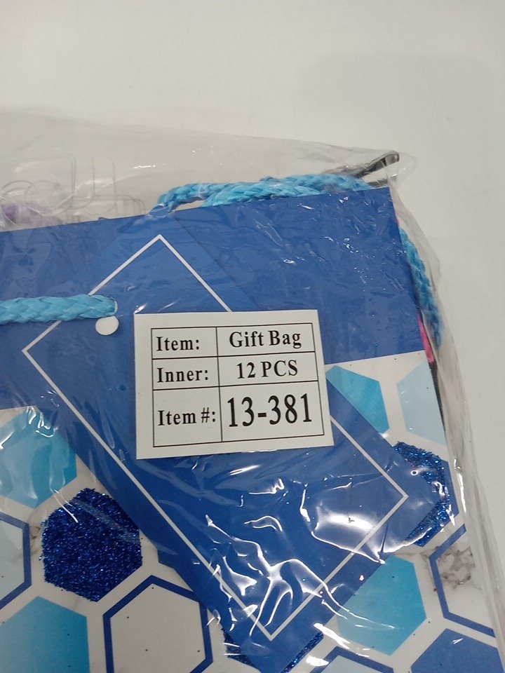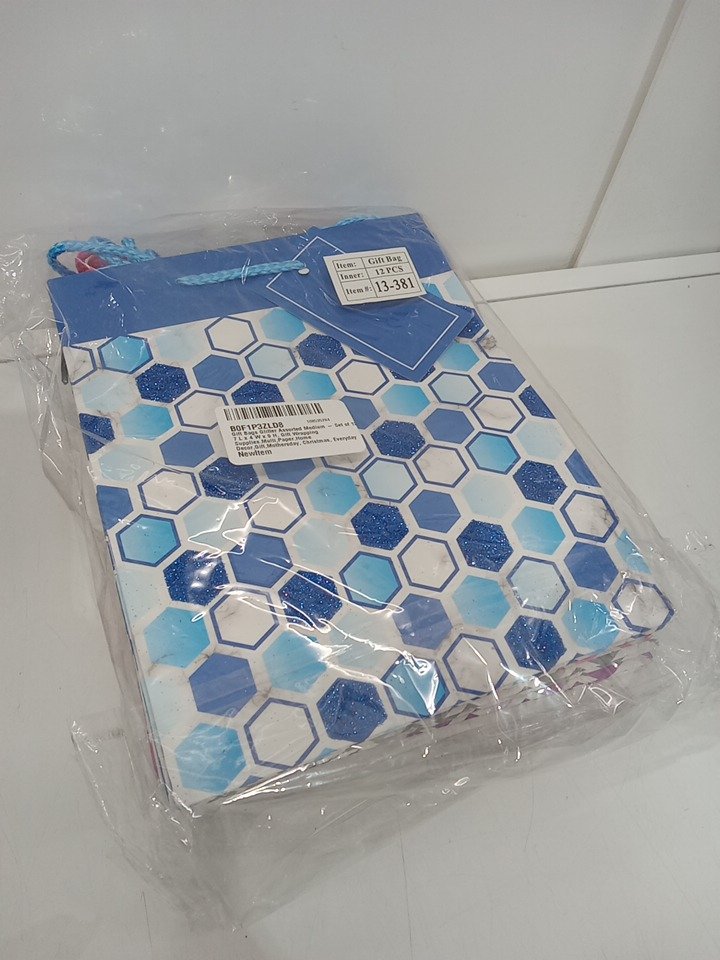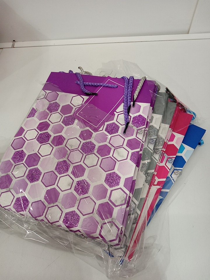 12 Assorted Glitter Hexagon Pattern gift bags - 7" x 9" - Assorted Colours