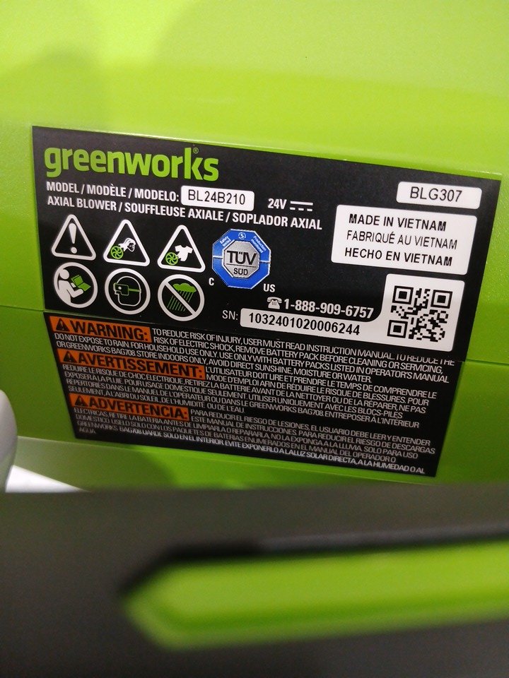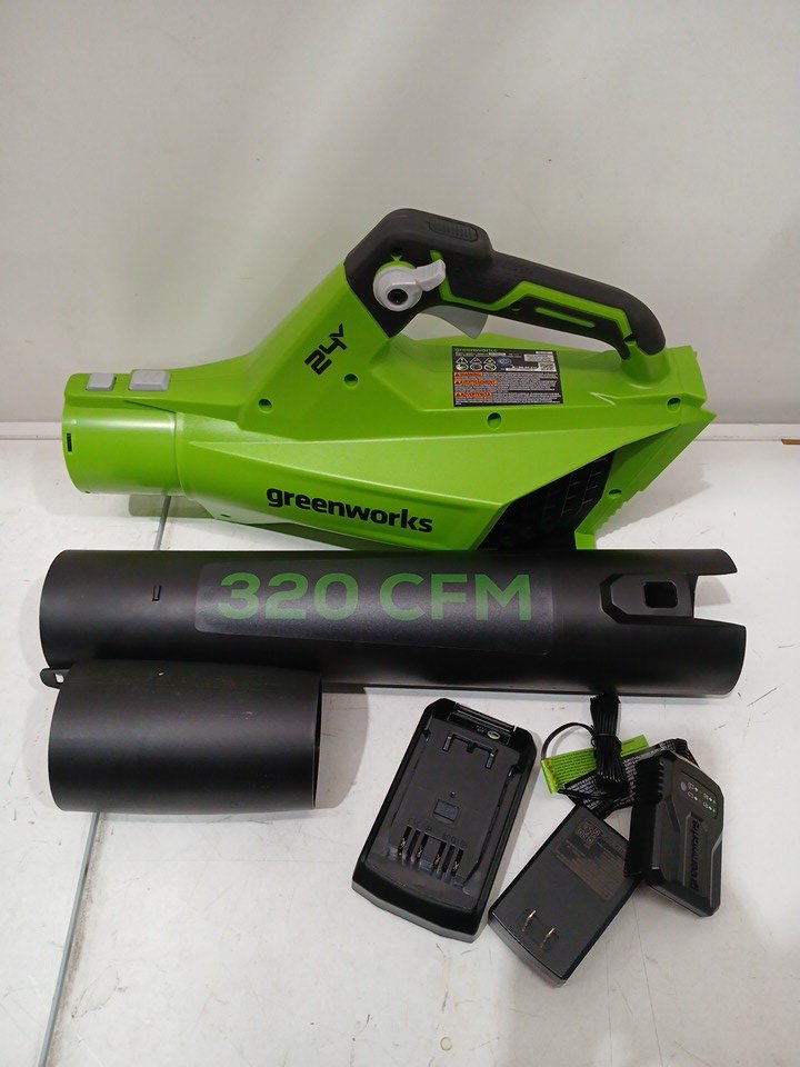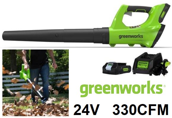 greenworks axial leaf blower with charger & battery - 330cfm 24v - green (model: bl24b210)