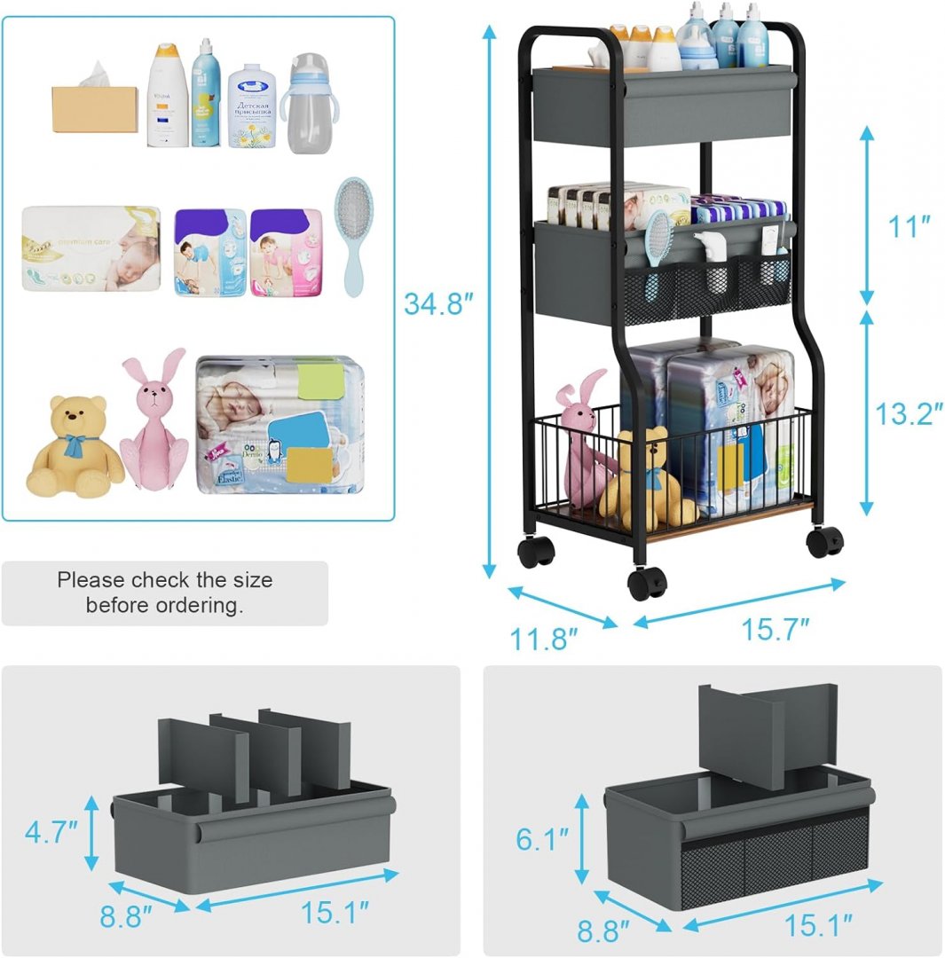 3-tier NEYCIL Baby Diaper Caddy Organizer and Storage Cart with 4+3 Dividers - BLACK