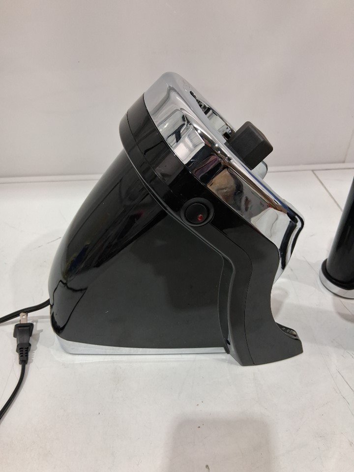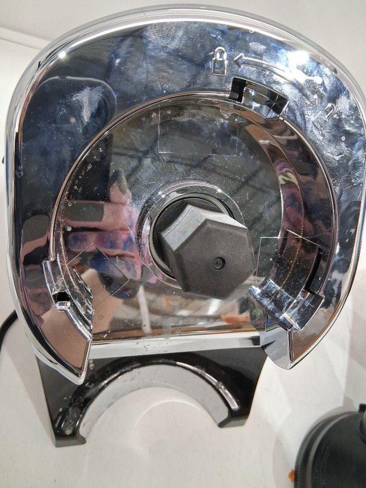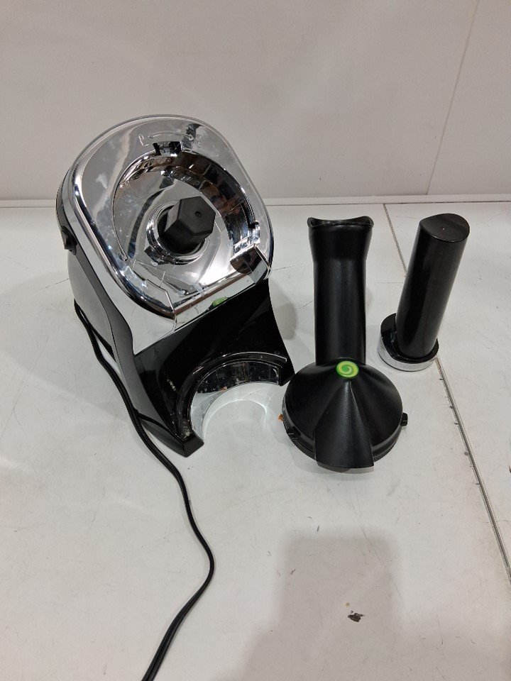 Item shows signs of light use, food/dirt residue present on exterior of base unit and within food chute/grinder (see photos). Missing recipe book. Tested for power.