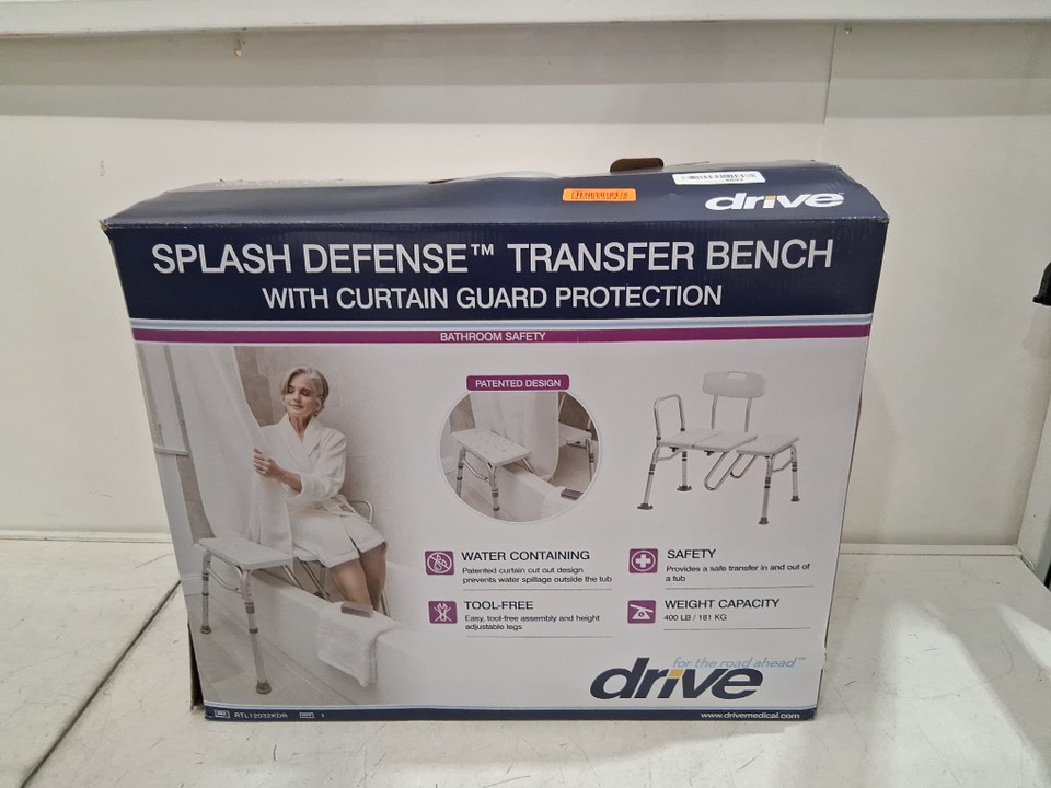 Drive Medical Splash Defense Tub Transfer Bench for Bathtub with Curtain Guard Protection - 400LB MAX, 28" L x 16" D - WHITE AND SILVER - (MODEL: RTL12032KDR)