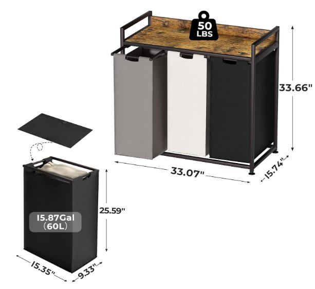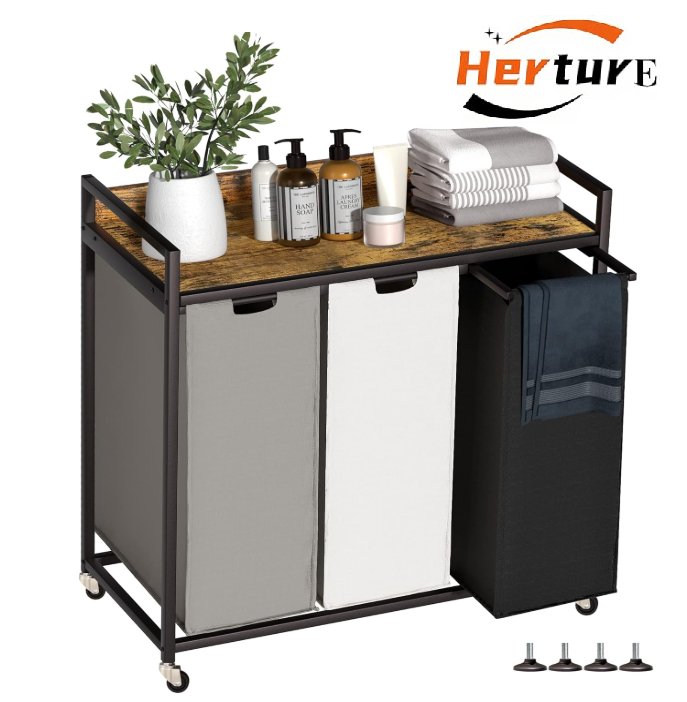 herture laundry hamper shelf with 3 pullout removable washable bags 60L x 3 (total 180L) - rustic brown/black (model:‎ PF04XLN )