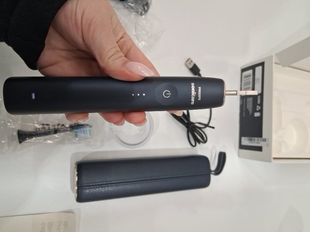 There is a bit of toothpaste residue on the brush handle and one of the included brush heads came opened. We have replaced the opened brush head with a sealed one. Please see photos.