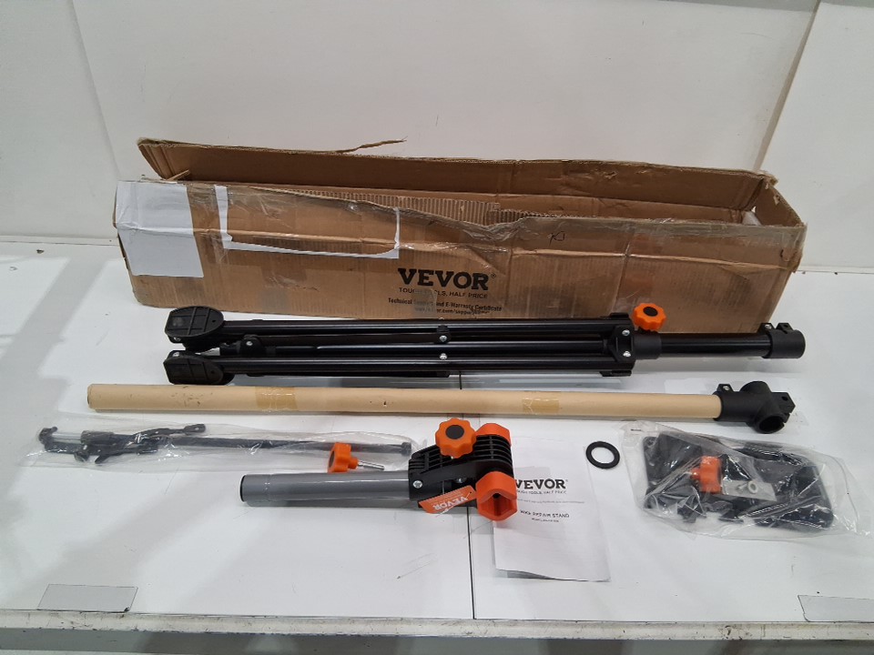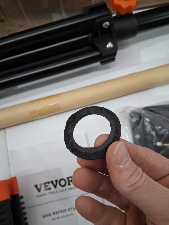 There is a broken plastic ring in the packaging, but we are not able to determine where it is from. The stand otherwise appears new (see photos)